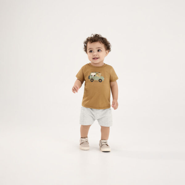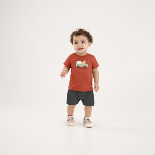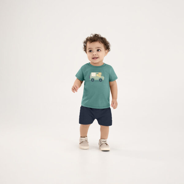 O conjunto Pulla Bulla é composto por uma camiseta em meia malha com estampa criativa e aplique interativo, que estimula o toque e a curiosidade dos pequenos. A bermuda em piqueton 100% algodão completa o visual com um caimento leve e confortável, ideal para dias cheios de brincadeiras e descobertas.