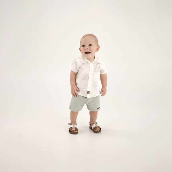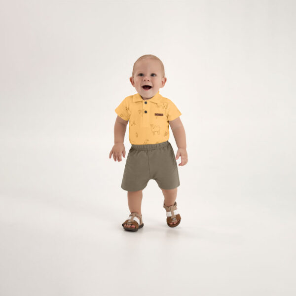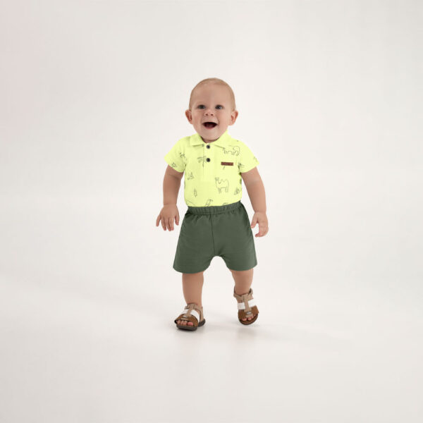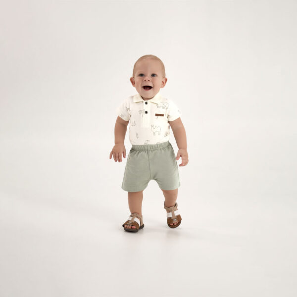 O conjunto é composto por um body tipo polo confeccionado em suedine 100% algodão, com gola e detalhe termocolante que trazem um charme especial à peça. A bermuda em moletinho complementa o visual com leveza e liberdade de movimento, perfeita para os dias ativos e descontraídos da primavera.