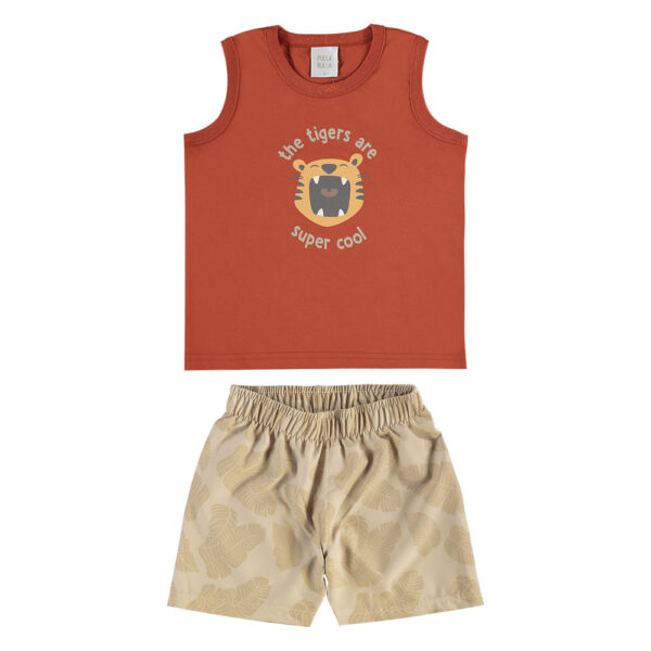 O conjunto Primeiros Passos Pulla Bulla é ideal para acompanhar o ritmo do seu menininho com leveza e liberdade. A regata confeccionada em meia malha 100% algodão traz uma divertida estampa de tigre que combina com a energia da infância. Já o shorts, feito em nylon com elastano, garante frescor e mobilidade para explorar o mundo com conforto e estilo.