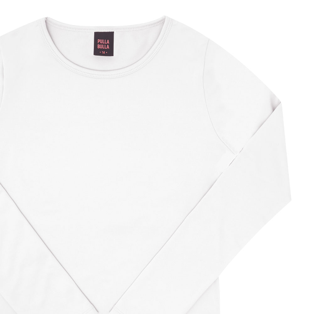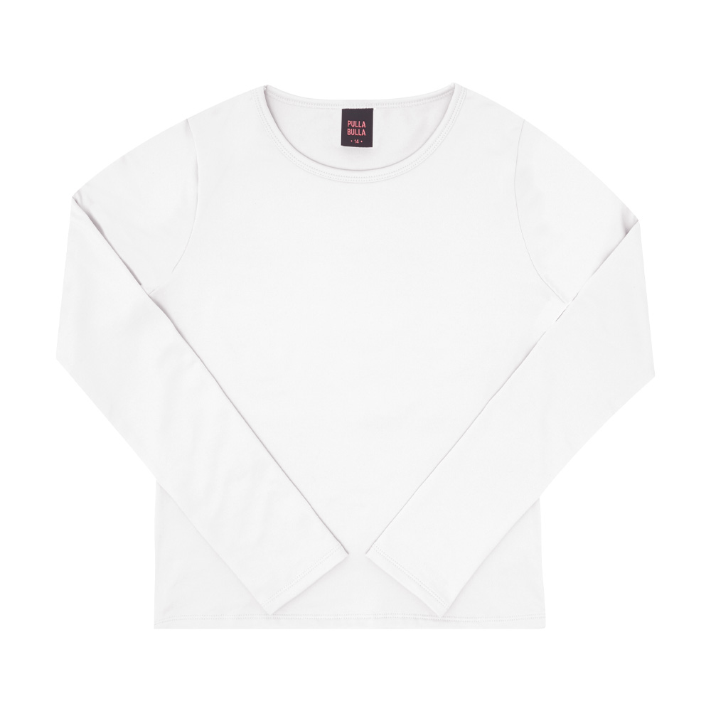 Para ir a escola ou aproveitar o dia em casa sem passar frio e com muito estilo! A blusa térmica na cor branco de manga longa vai ser peça curinga para as meninas aproveitarem os dias mais friozinhos da estação.