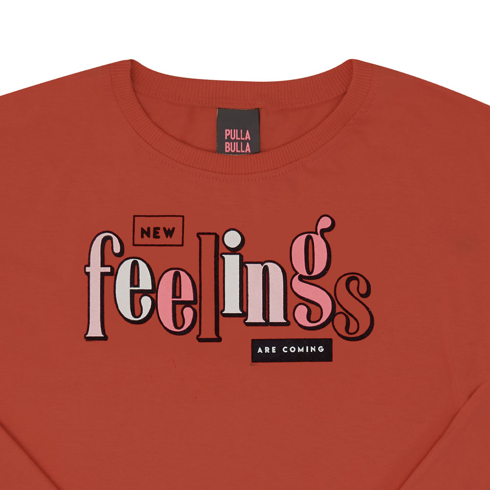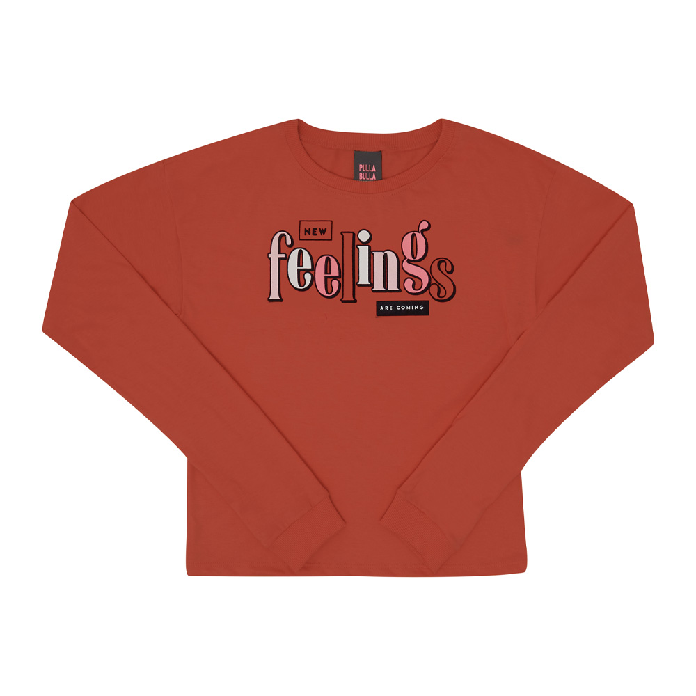 Blusinha meia malha que vai deixar o look da sua fashionista ainda mais estiloso para ela curtir o dia com as amigas! A blusa na cor páprica possuí estampa frontal com escrita “Novos sentimentos estão chegando”.