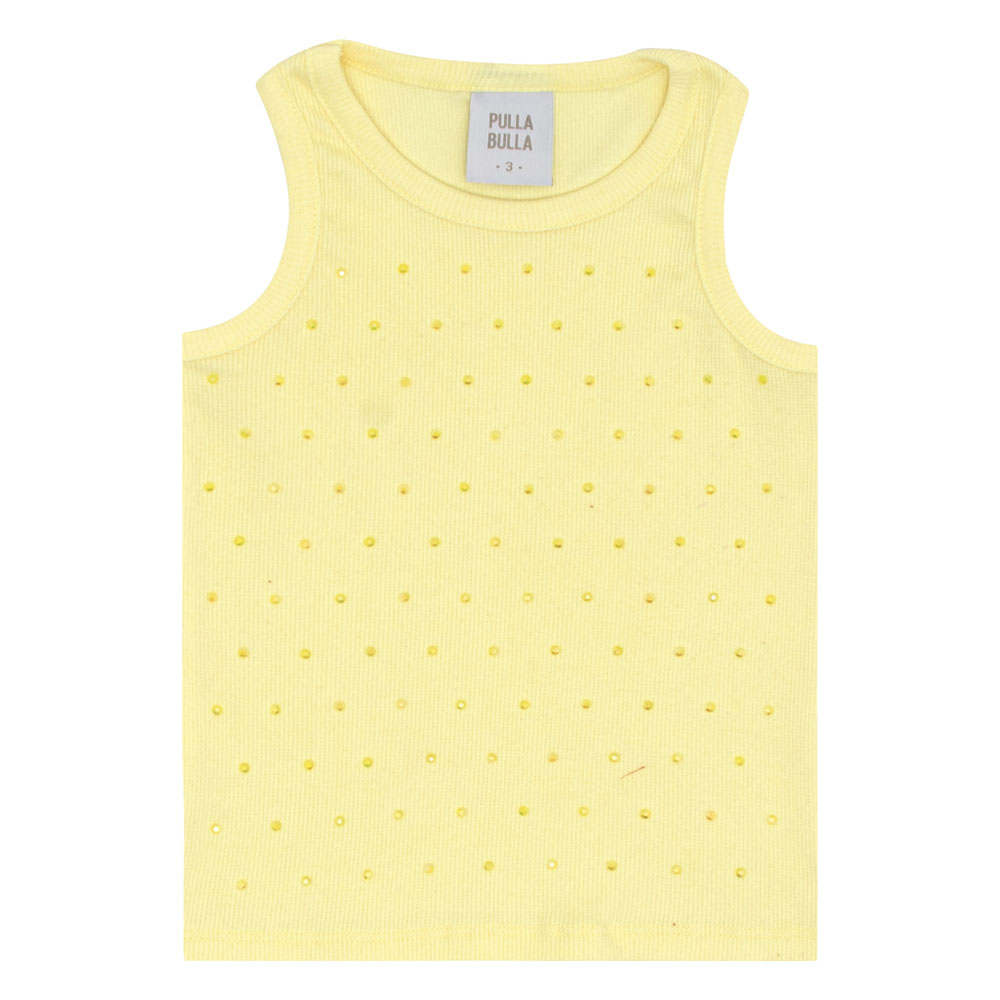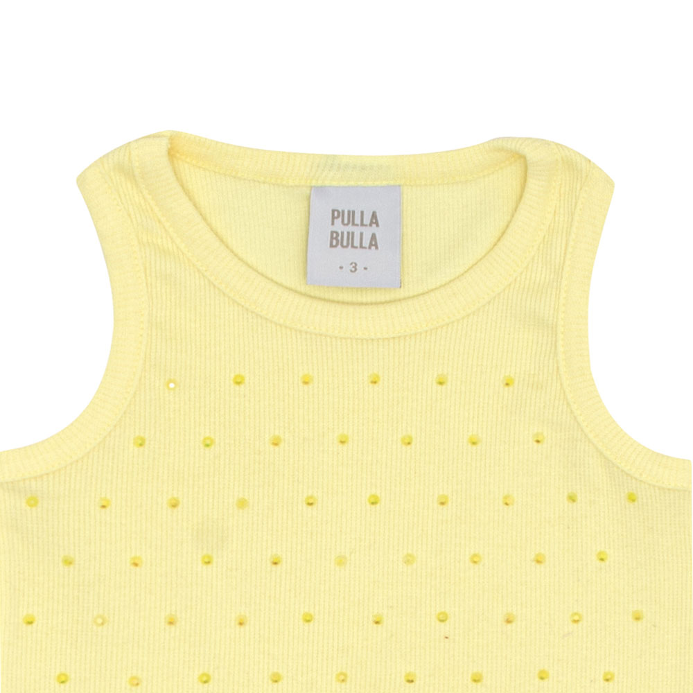 Blusa regata primeiros passos feminina, confeccionada em ribana com elastano leve na cor amarelo, proporcionando conforto e ajuste perfeito ao corpo. A peça conta com aplicação de strass por toda a extensão, trazendo brilho e delicadeza ao look. Ideal para dias quentes e refrescantes, pode ser combinada com shorts ou saias leves e sandálias para um look confortável e estiloso.