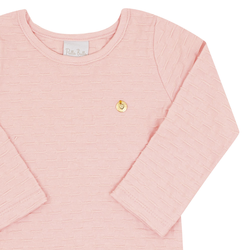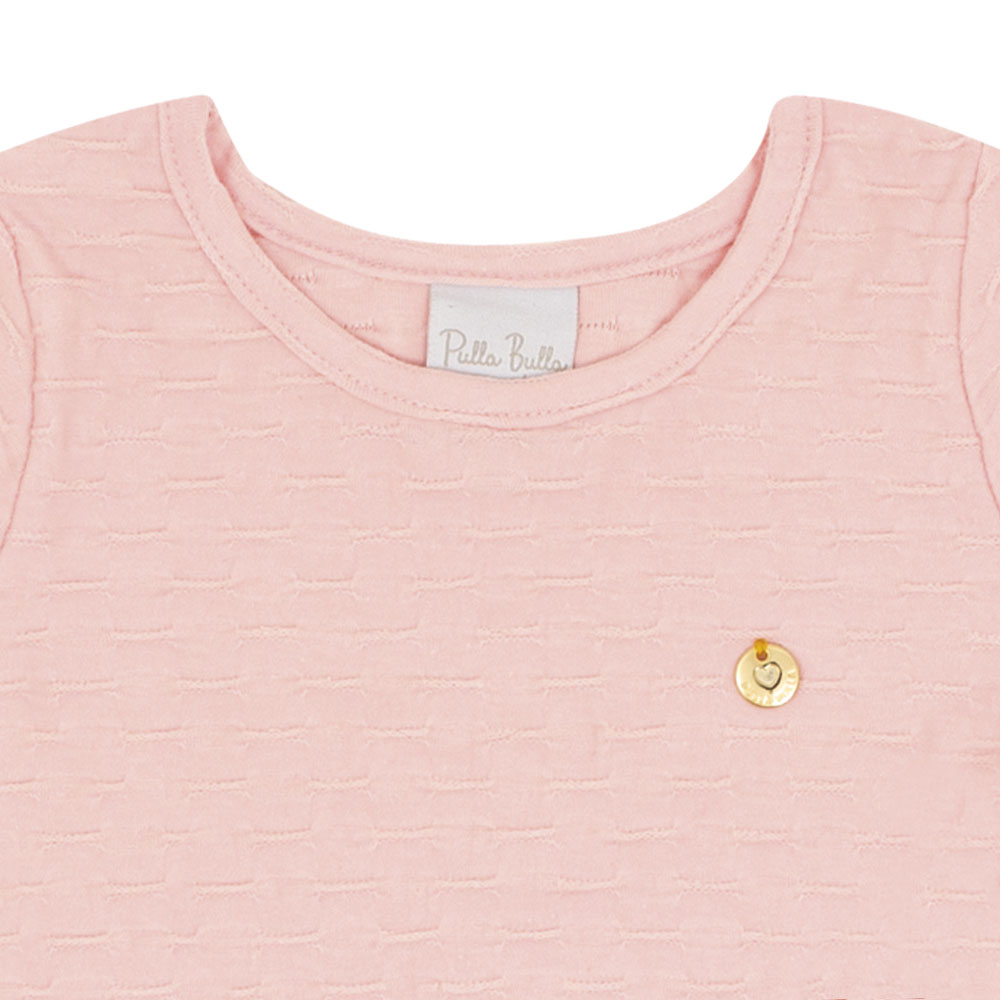 Body rose em cotton leve trabalhado, com detalhe em plaquinha metálica dourada. Possui abertura por botões de pressão entre as pernas para facilitar as trocas. Confortável e delicado, ideal para usar com jardineiras, shorts ou calças nos dias fresquinho