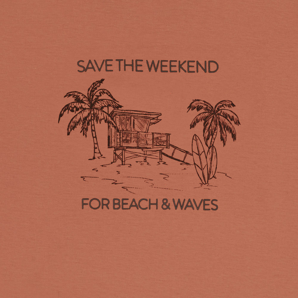 Camiseta infantil em meia malha na cor ferrugem, com uma estampa tropical em gel relevo que traz o espírito das ondas e coqueiros da praia, perfeito para crianças cheias de energia e apaixonadas por aventuras ao ar livre.