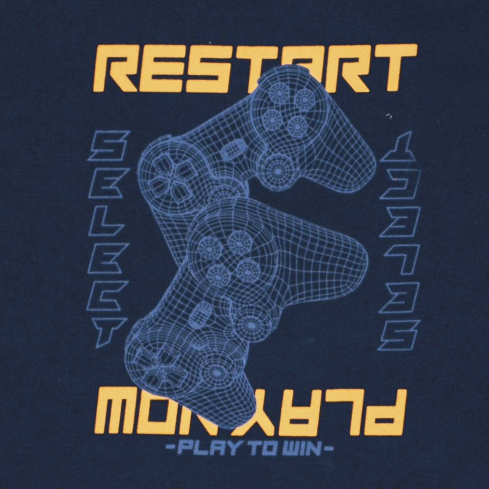 A camiseta perfeita para os pequenos apaixonados por games! Confeccionada em meia malha na cor marinho de toque macio e confortável, essa peça traz uma estampa moderna com controles de videogame em estilo gráfico e frases como “Restart”, “Select” e “Play Now”, tudo em destaque com cores vibrantes.