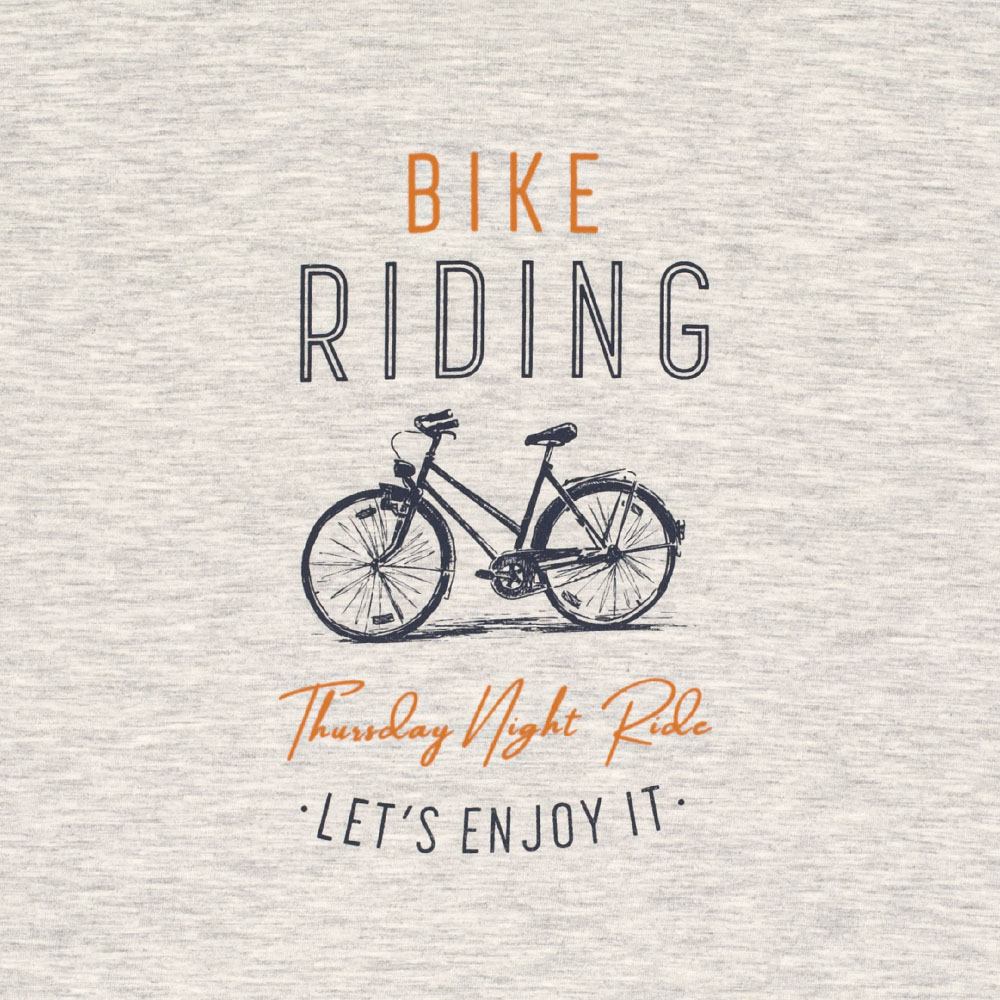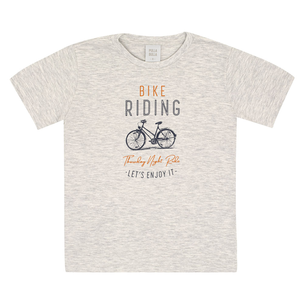 Camiseta masculina infantil confeccionada em meia malha na cor mescla banana, com estampa em puff de bicicleta e escritas que remetem ao espírito de aventura e diversão. Ideal para meninos que adoram bikes e explorar ao ar livre. Perfeita para temperaturas amenas ou dias quentes, garantindo conforto e estilo durante passeios ou momentos de lazer.