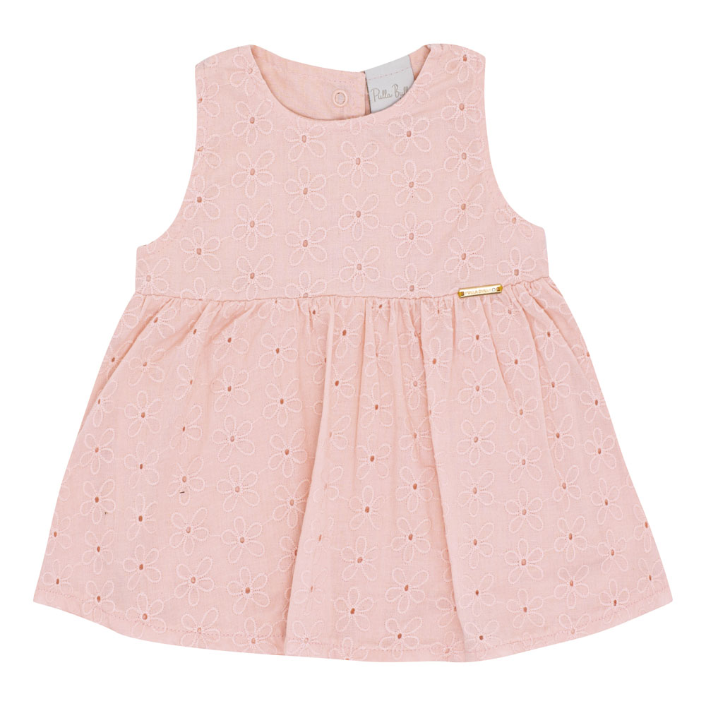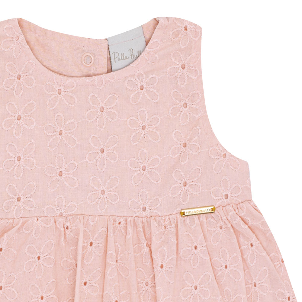 Conjunto bebê feminino composto por uma blusa em tecido laise na cor rosê, modelo regatinha, que traz frescor e delicadeza ao visual. A peça conta com uma plaquinha de metal próximo ao peito com a identificação da marca Pulla Bulla, adicionando um detalhe especial. O short na cor índigo claro é confeccionado em jeans leve com elastano, proporcionando conforto e liberdade de movimento para a criança. Uma combinação perfeita para os dias mais quentes, unindo estilo e praticidade.