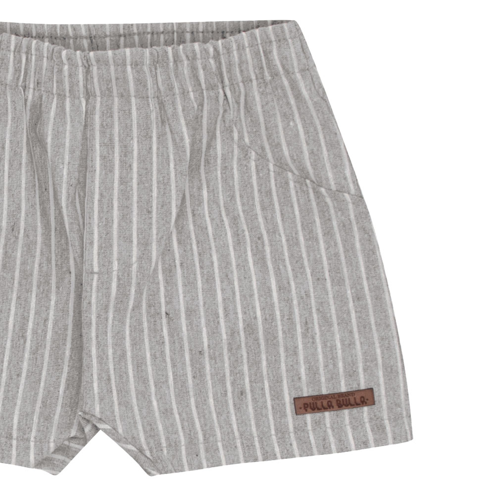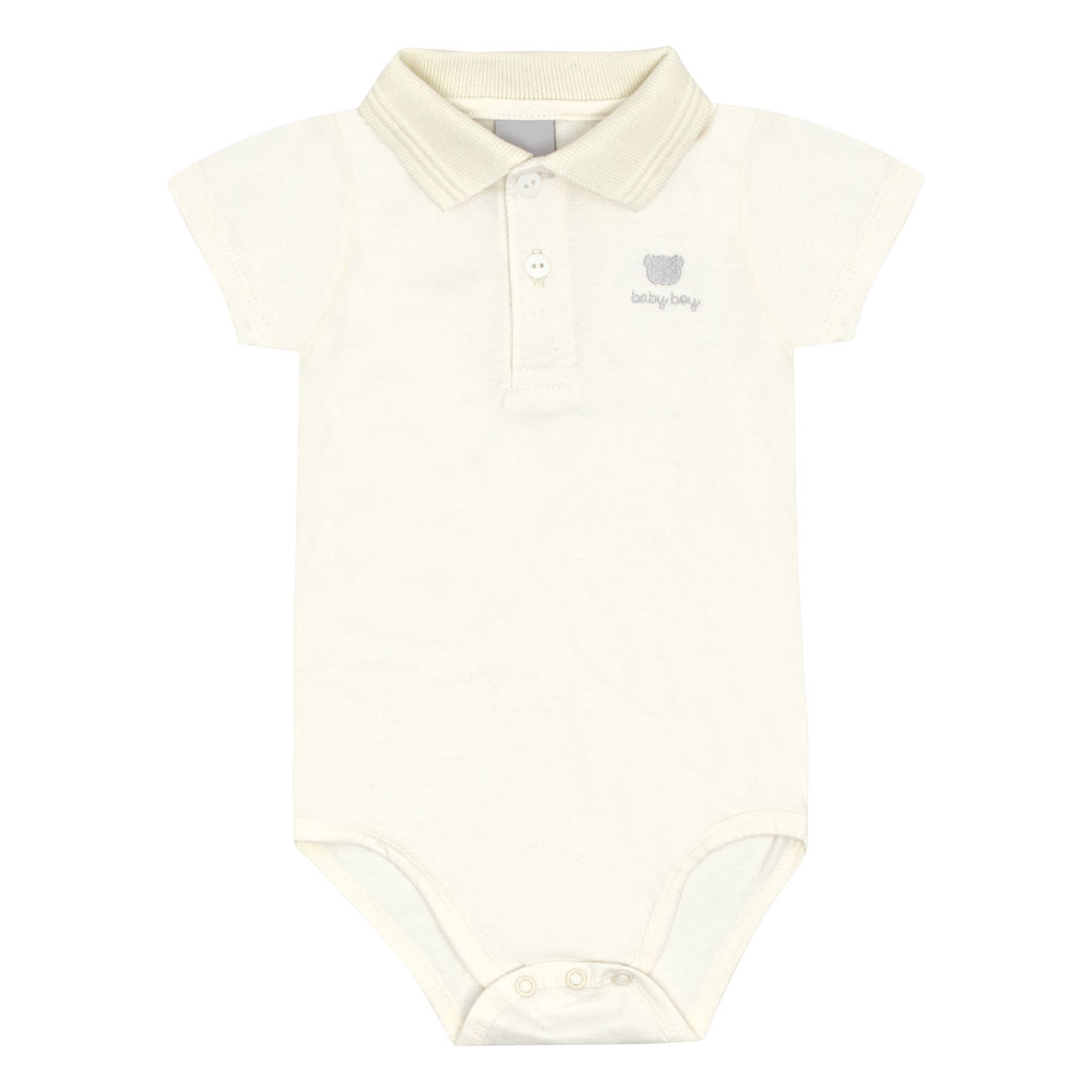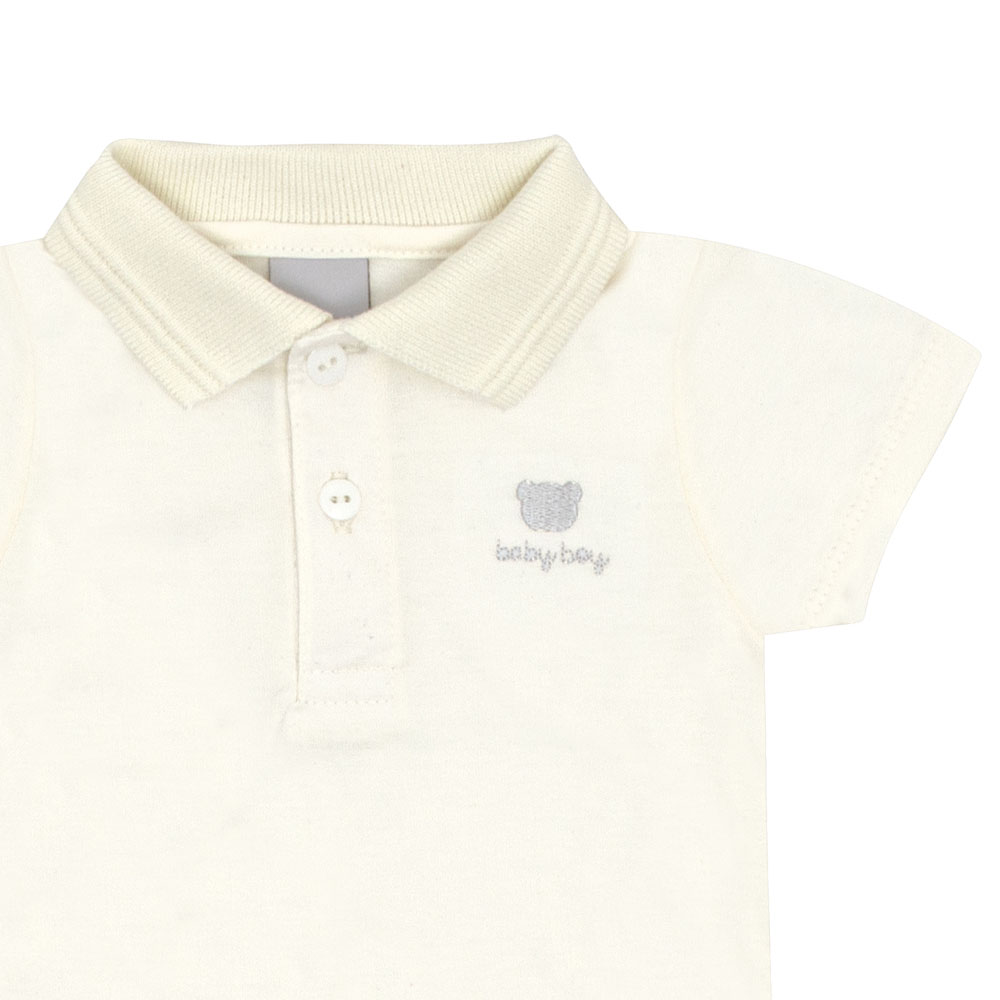 Conjunto bebê masculino composto por um body em piquet com elastano na cor off white, modelo polo que une estilo e conforto. O body apresenta abertura de botões na gola para facilitar o vestir e um bordado de ursinho próximo ao peito, trazendo delicadeza à peça. A bermuda é confeccionada em tecido eco listrado vertical na cor mescla cinza, com bolso lateral, aplique termocolante próximo à barra e cintura de elastano, garantindo conforto e segurança durante as brincadeiras. Perfeito para ocasiões especiais!