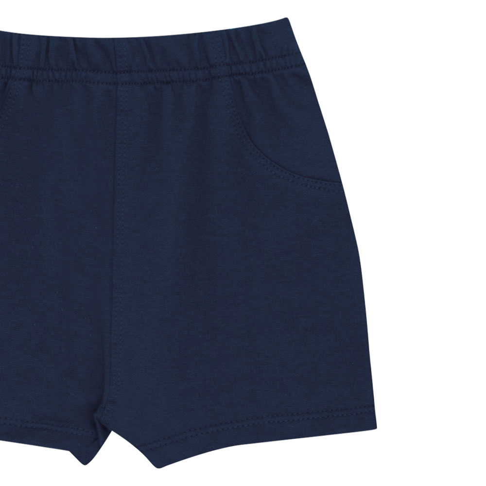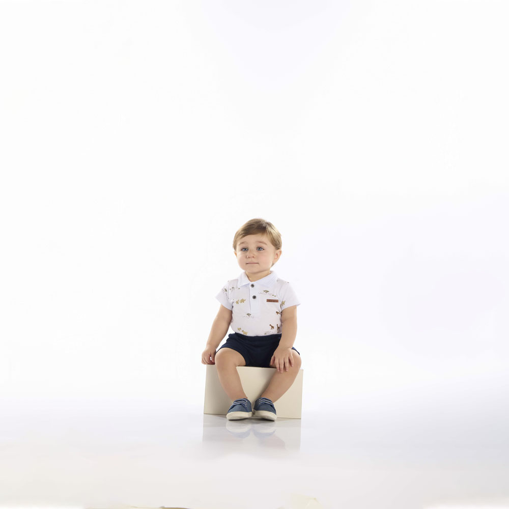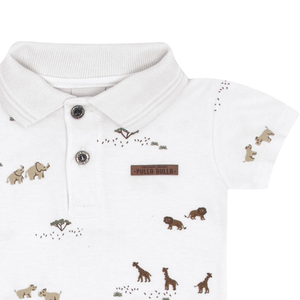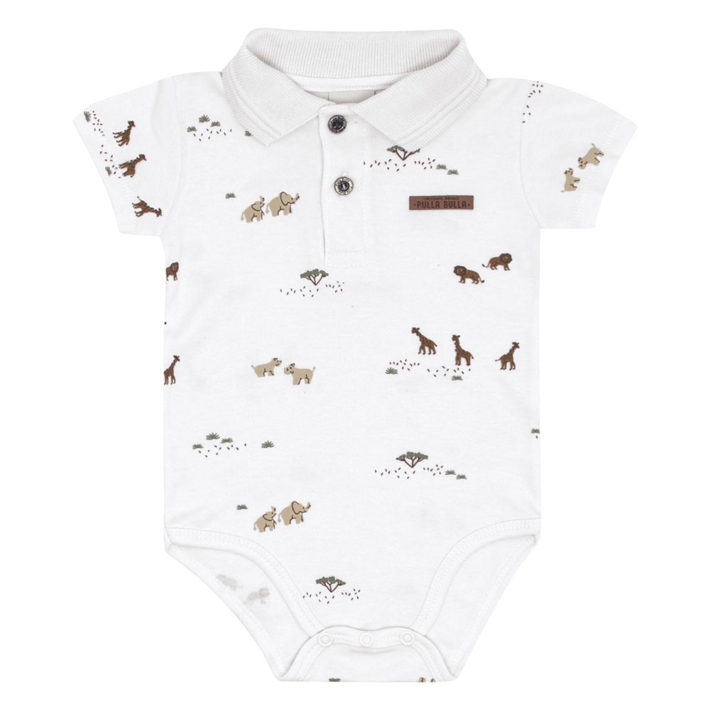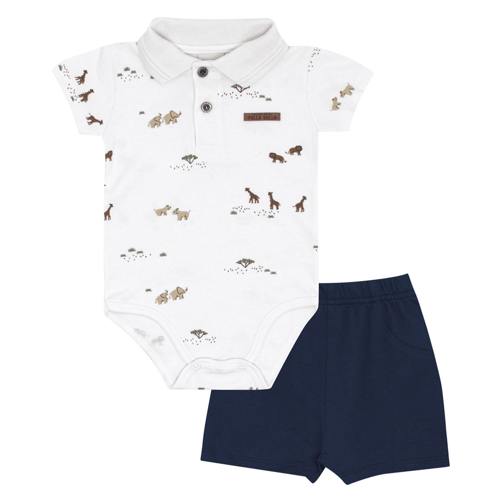 Conjunto bebê masculino composto por um body em suedine na cor branco com estampa pequena de safari por toda peça, trazendo um visual lúdico e encantador. O body conta com um aplique termocolante próximo ao peito com a identificação da marca Pulla Bulla. A bermuda é confeccionada em moletinho na cor marinho, com bolso lateral e cintura de elastano, garantindo conforto e segurança durante as brincadeiras.