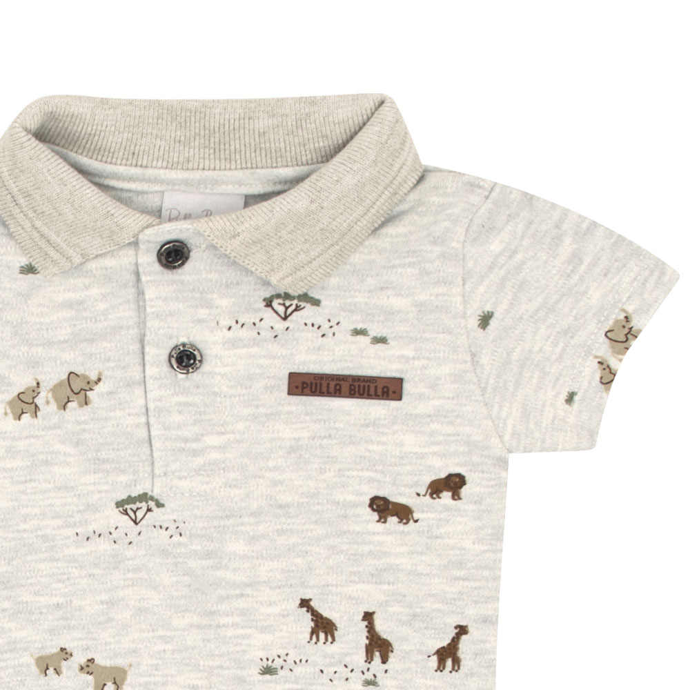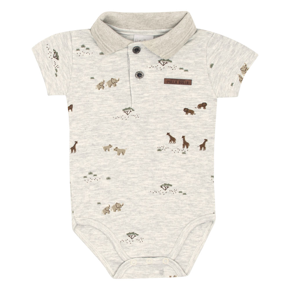 Conjunto bebê masculino composto por um body em suedine na cor mescla banana com estampa pequena de safari por toda peça, trazendo um visual lúdico e encantador. O body conta com um aplique termocolante próximo ao peito com a identificação da marca Pulla Bulla. A bermuda é confeccionada em moletinho na cor floresta, com bolso lateral e cintura de elastano, garantindo conforto e segurança durante as brincadeiras.