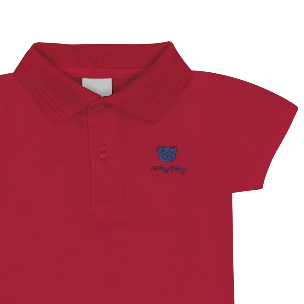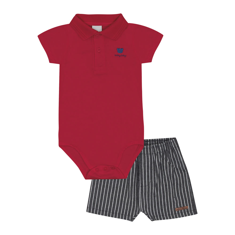 Conjunto bebê masculino composto por um body em piquet com elastano na cor vermelho, modelo polo que une estilo e conforto. O body apresenta abertura de botões na gola para facilitar o vestir e um bordado de ursinho próximo ao peito, trazendo delicadeza à peça. A bermuda é confeccionada em tecido eco listrado vertical na cor preto, com bolso lateral, aplique termocolante próximo à barra e cintura de elastano, garantindo conforto e segurança durante as brincadeiras. Perfeito para ocasiões especiais!