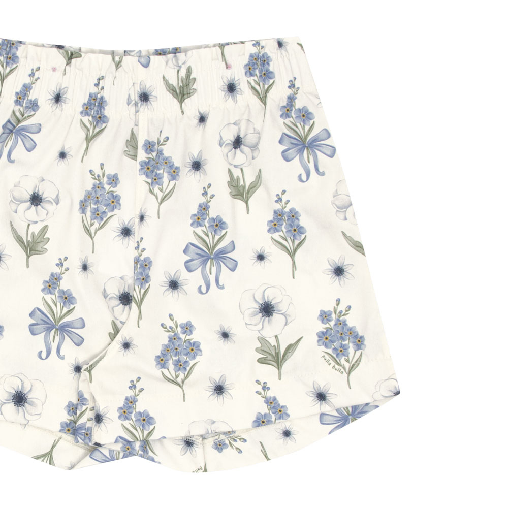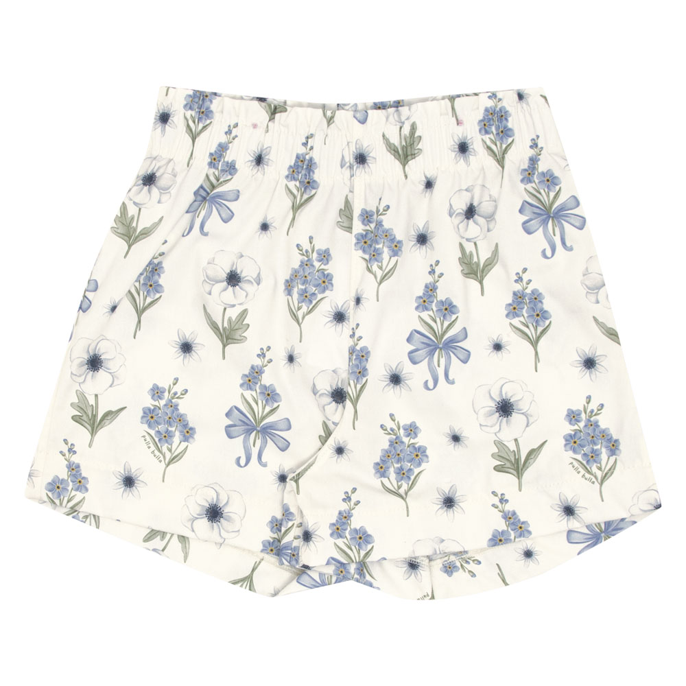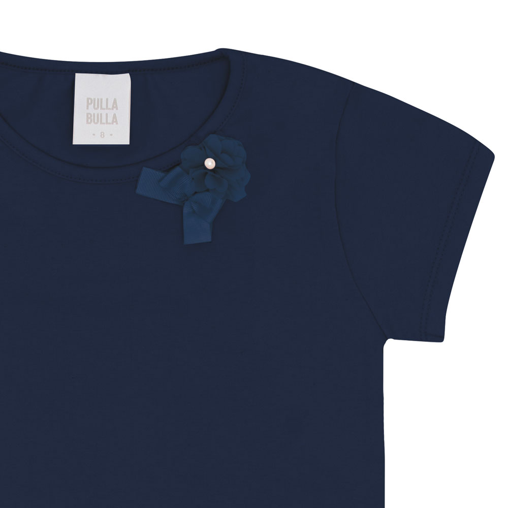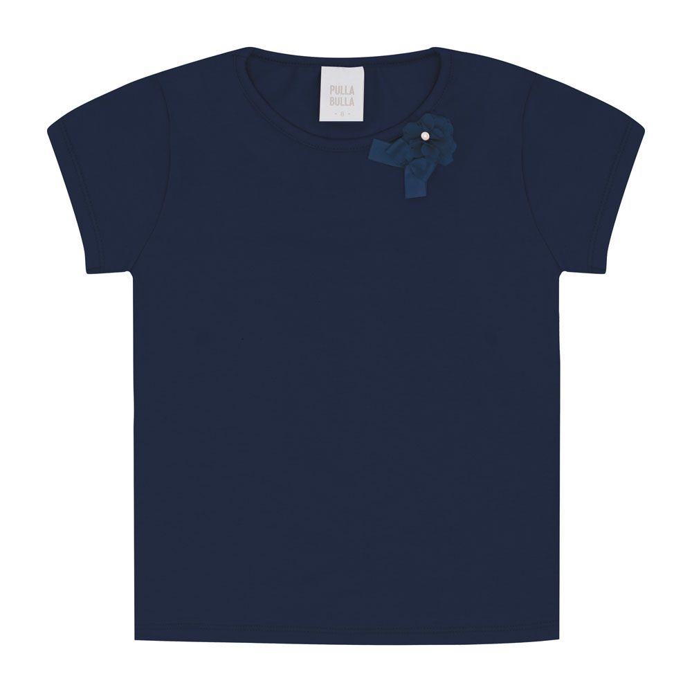 Conjunto composto por uma blusa em cotton leve trabalhado na cor marinho com aplique de laço e flor com pérola próximo à gola. O short off white é confeccionado em sarja leve, com elástico na cintura para maior conforto e estampa digital florida que completa o visual com elegância. Ideal para usar em passeios de família!