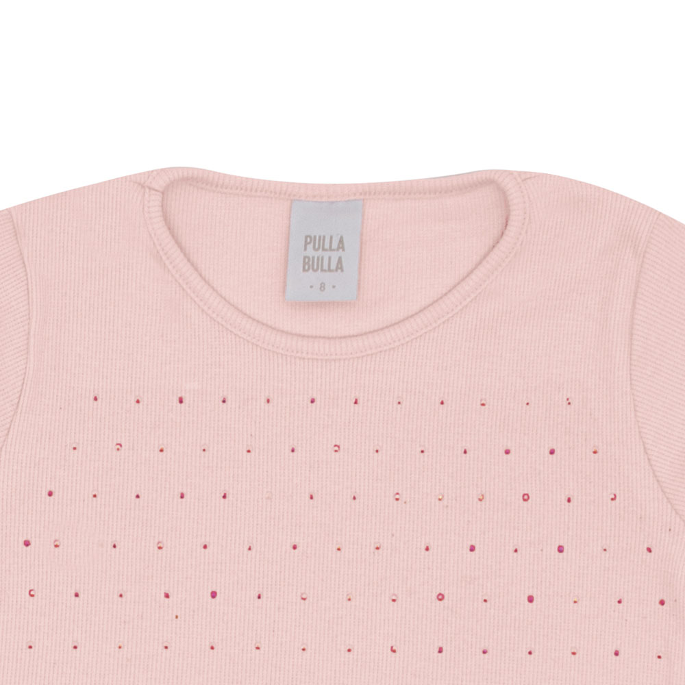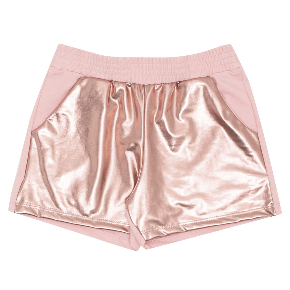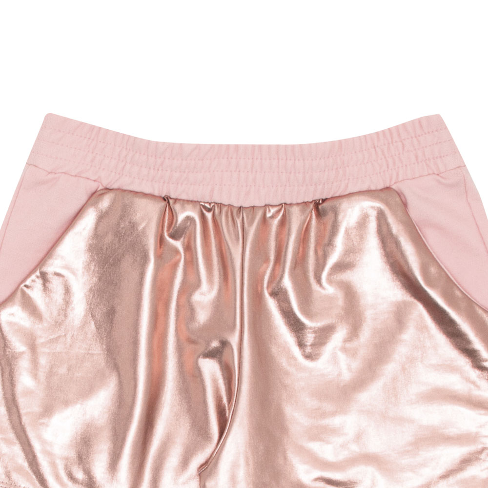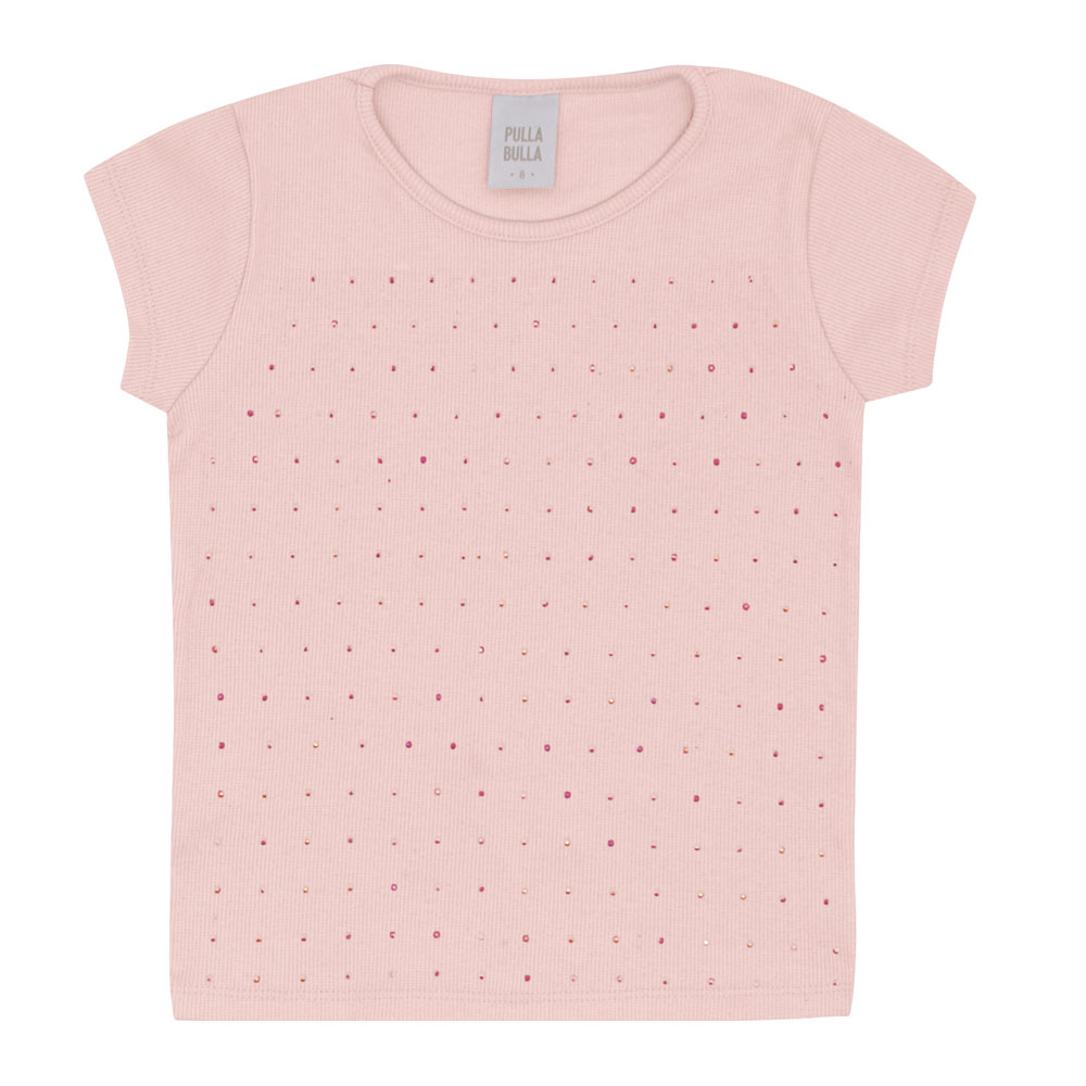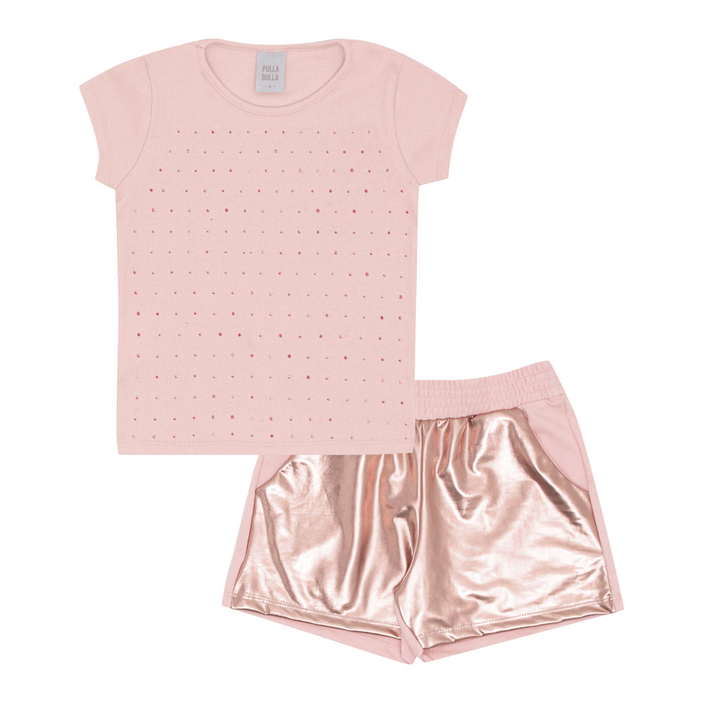 Conjunto composto por uma blusa em ribana com elastano leve na cor rosê com aplicação de strass em toda a parte frontal. O short é confeccionado em moletinho com detalhes em malha foil na cor rosê, possui bolsos laterais e cós com elastano, garantindo conforto e praticidade. Ideal para usar em passeios divertidos com a dinda!