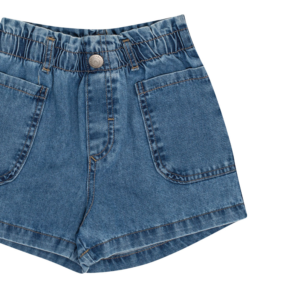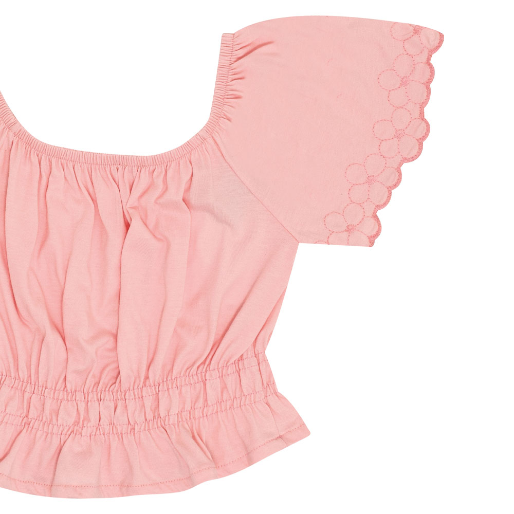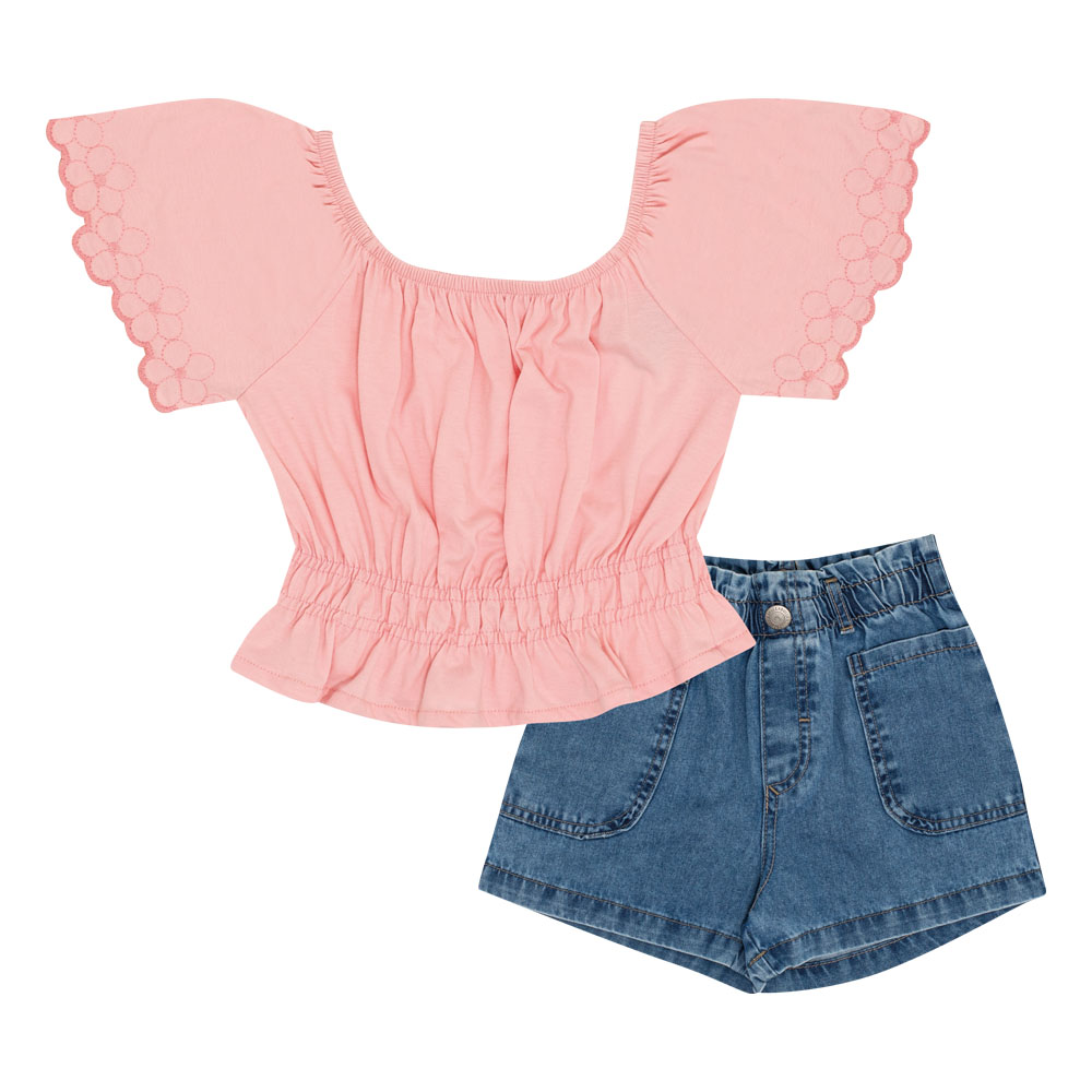 Conjunto perfeito para dias ensolarados! Composto por blusa meia malha na cor rosê, mangas curtas, bordado diferenciado nas mangas e elástico franzido na cintura deixando a peça ainda mais charmosa e perfeita para os dias quentes. Já o short jeans índigo médio possuí elastano na cintura, bolsos funcionais e fechamento em botão frontal.
