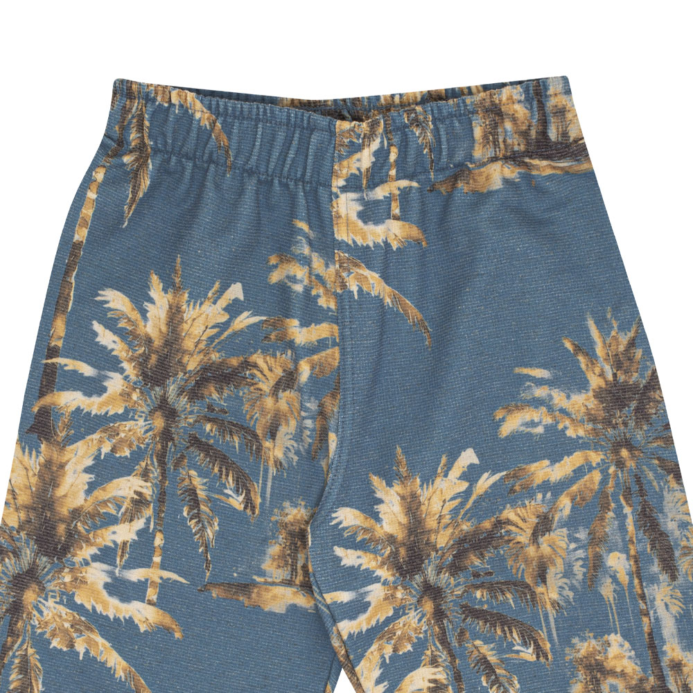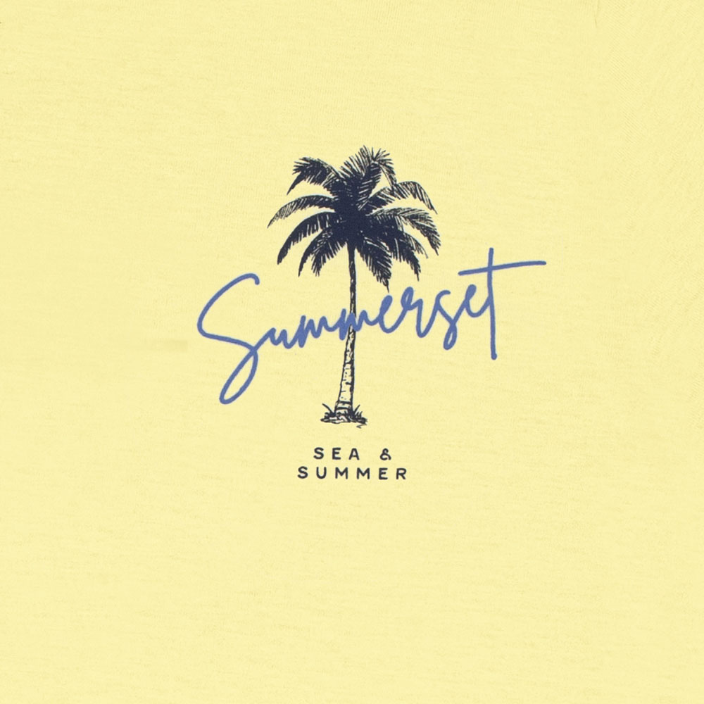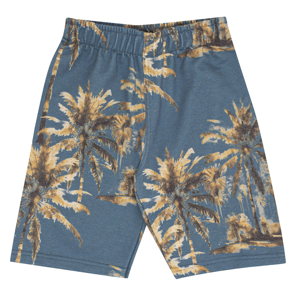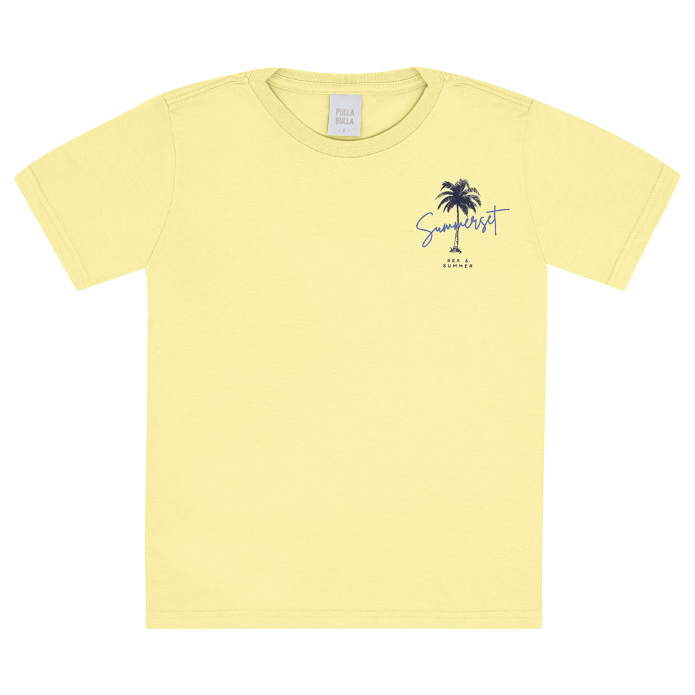 Conjunto composto por camiseta meia malha na cor amarelo, estampa com puff de uma palmeira próximo ao peito do lado esquerdo e escrita “conjuntos de verão. Mar e verão.” complementando o look com bermuda moletom linho na cor azul cobalto sublimado com palmeiras pela peça, ideal para os aventureiros que adoram praia e um passeio divertido em família!