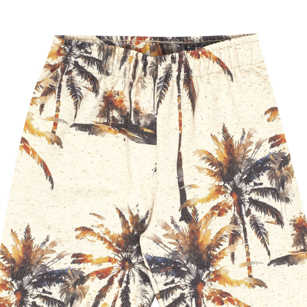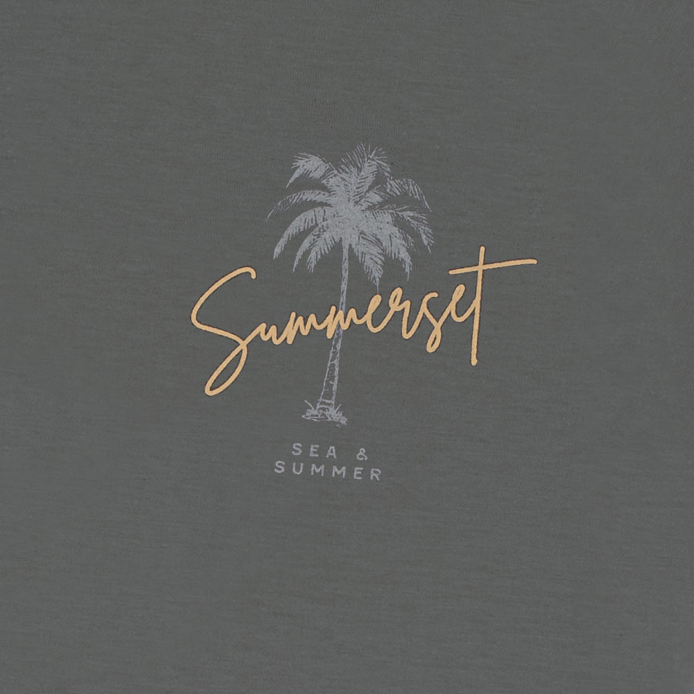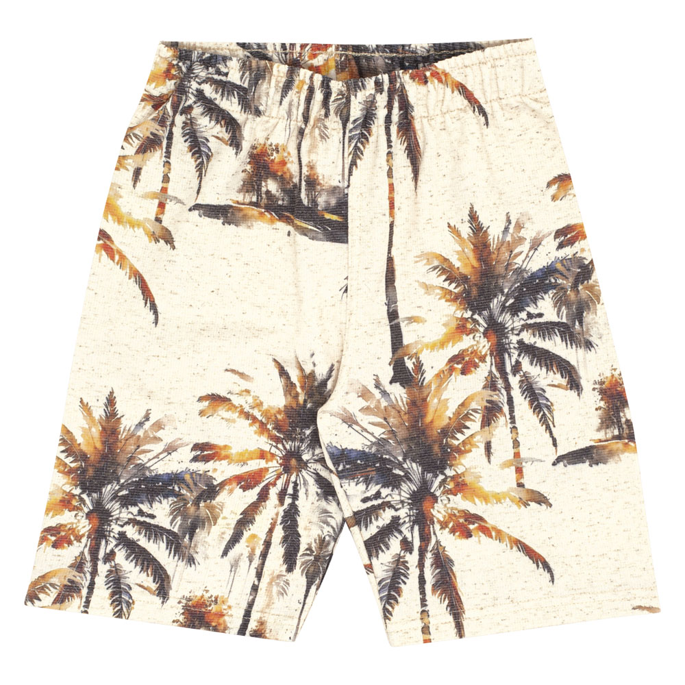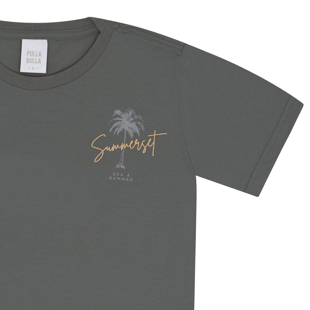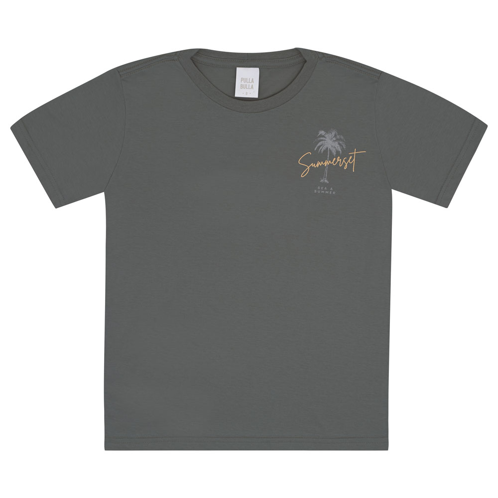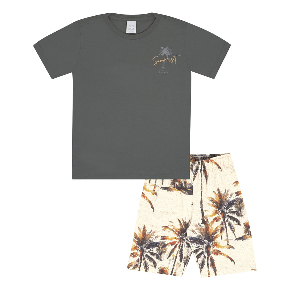 Conjunto composto por camiseta meia malha na cor carbono, estampa com puff de uma palmeira próximo ao peito do lado esquerdo e escrita “conjuntos de verão. Mar e verão.” complementando o look com bermuda moletom linho na cor sol sublimado com palmeiras pela peça, ideal para os aventureiros que adoram praia e um passeio divertido em família!