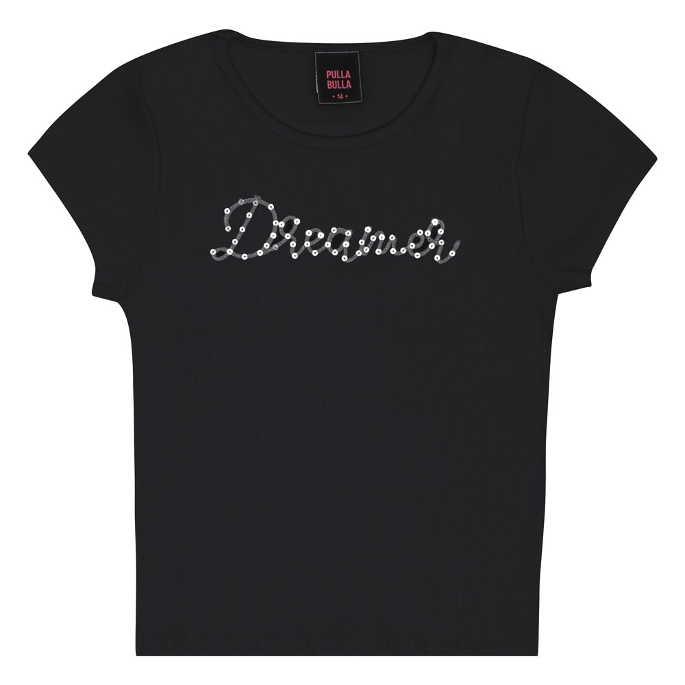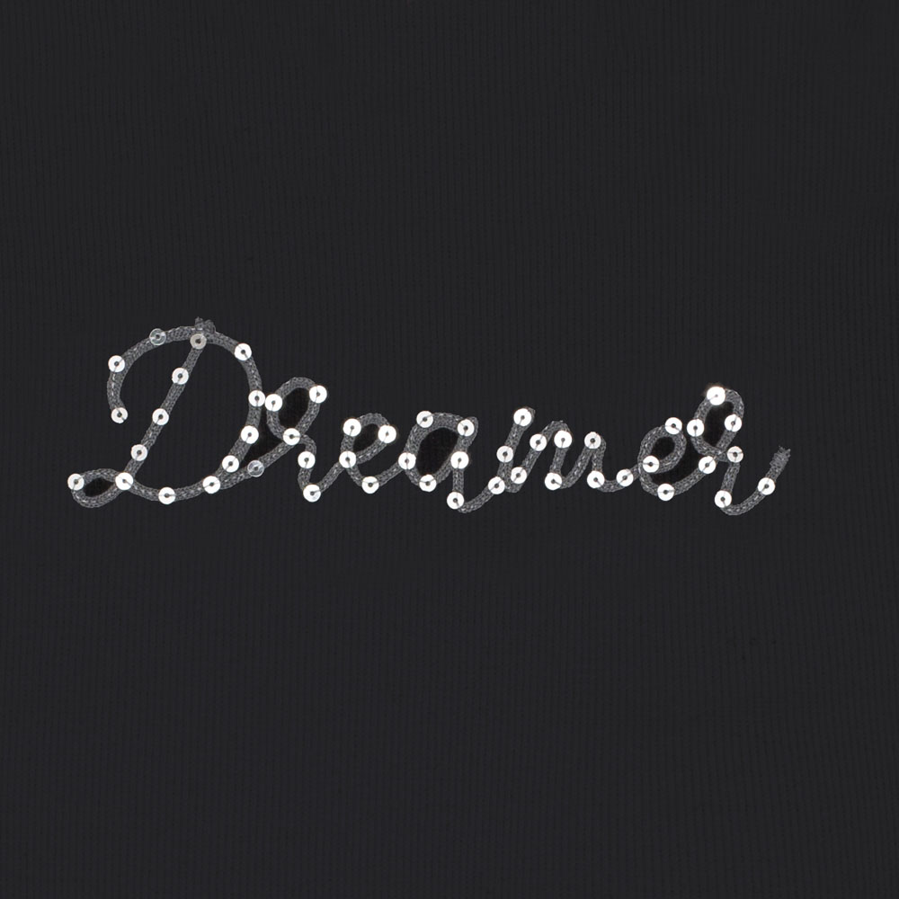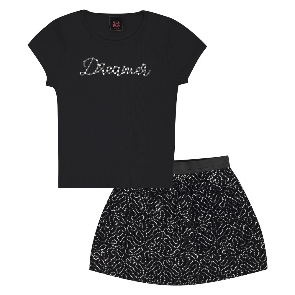 Conjunto preto com uma blusa em cotton leve com estampa bordada em cordel e a escrita ‘Dreamer’, cheia de charme e personalidade. A saia short plissada com paetês e toque suave em cotton leve é o complemento perfeito para um look confortável e glamouroso. Ideal para festas e ocasiões especiais!