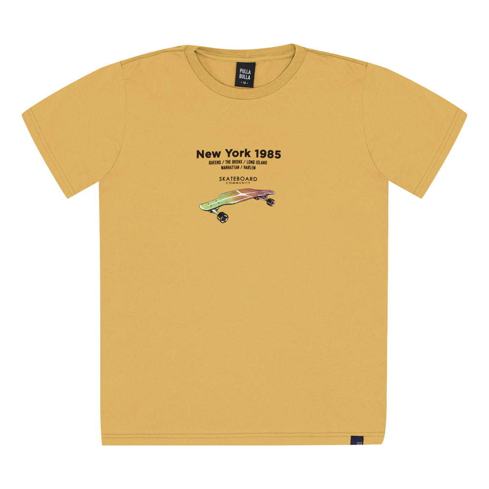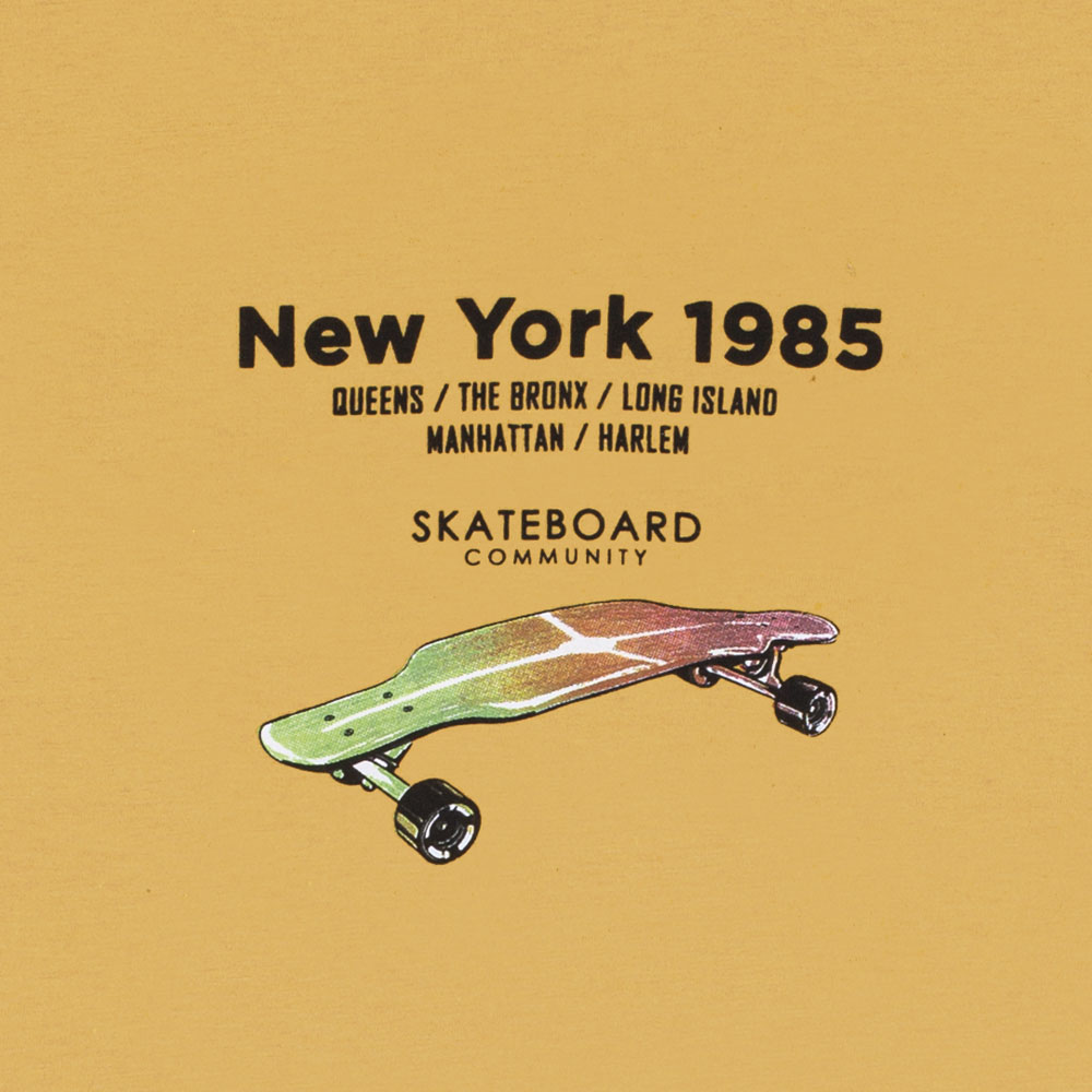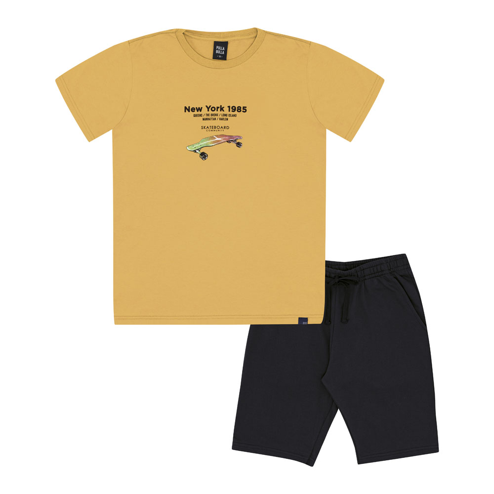 Conjunto masculino que combina estilo e conforto na medida certa. A camiseta na cor ocre em meia malha traz uma estampa minimalista com escrita em gel relevo, celebrando a vibe ‘New York 1985’ da comunidade do skate. A bermuda em moletom na cor preto, super confortável, completa o look com cores modernas e prontas para a ação.