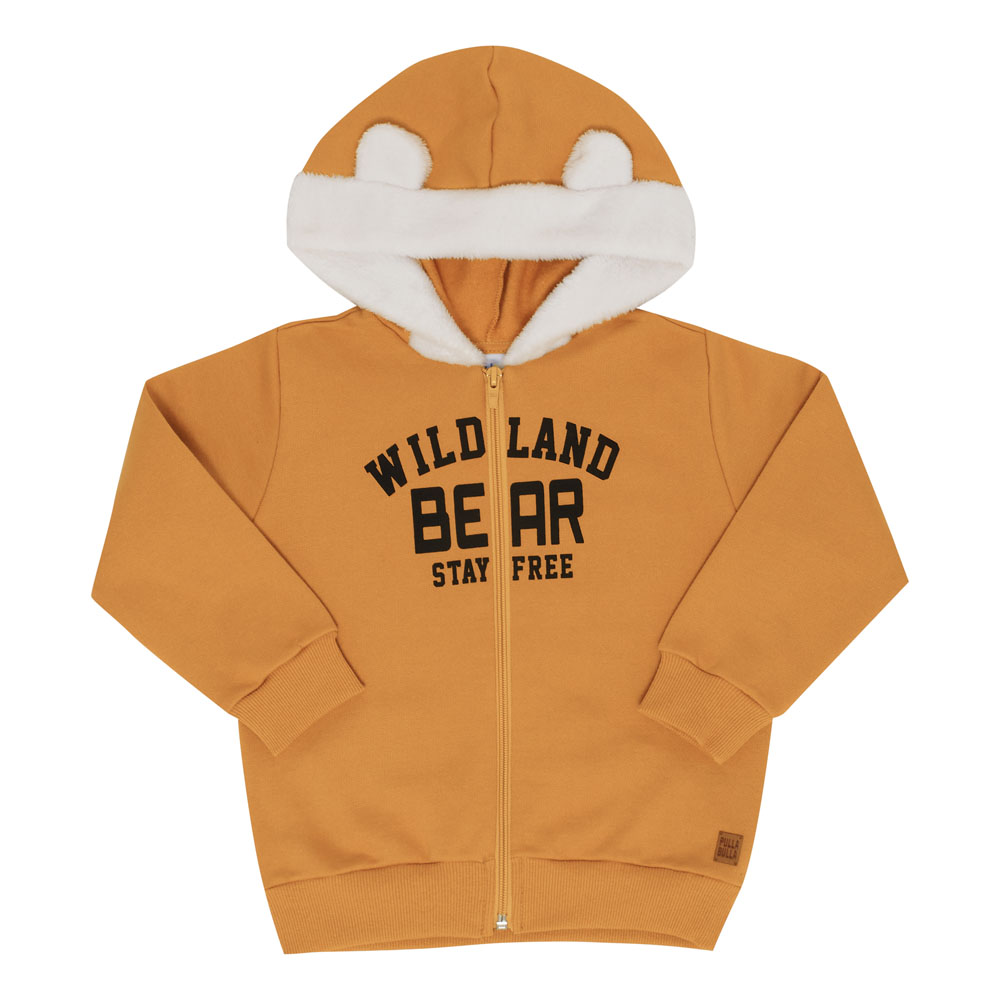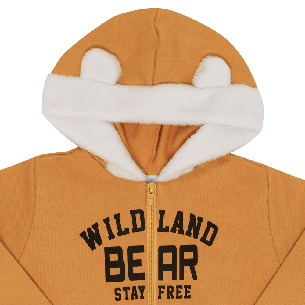 Esse conjuntinho foi pensado especialmente para seu menininho, super fofo e confortável. Uma Jaqueta na cor Amarelo ocre confeccionado em moletom com a estampa “Terra selvagem urso mantenha-o livre” e detalhes no capuz em pelo e para completa o look uma linda Calça na cor Mescla banana confeccionado em moletom com estampa de ursinhos, que vai deixar seu pequenino super estiloso.