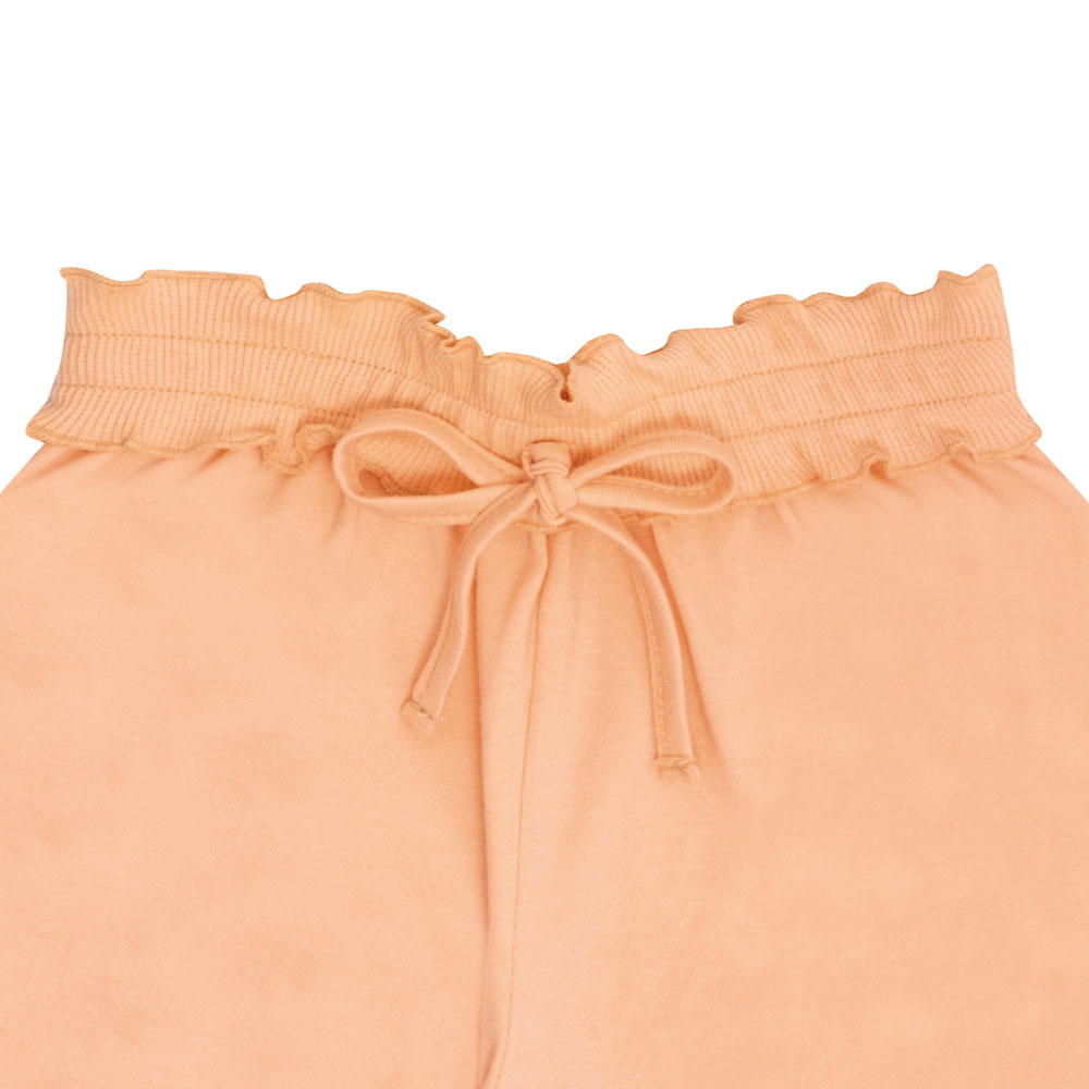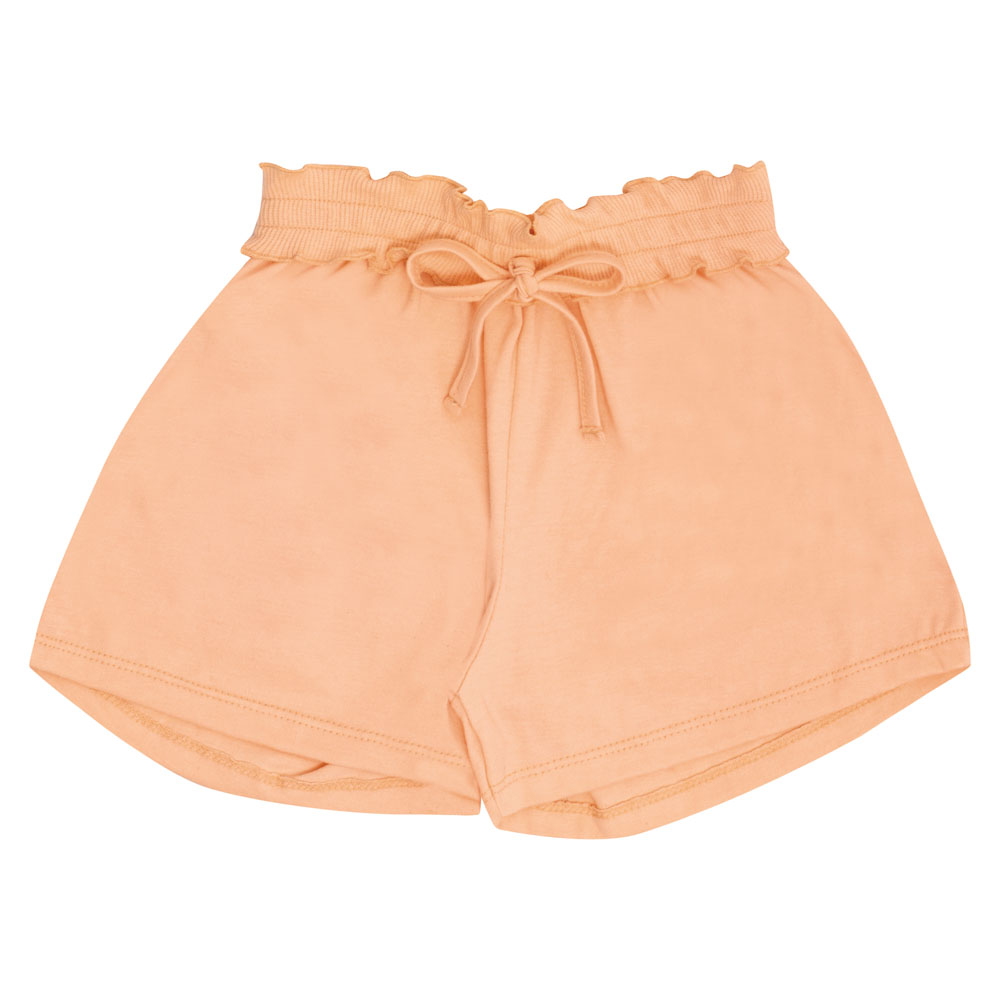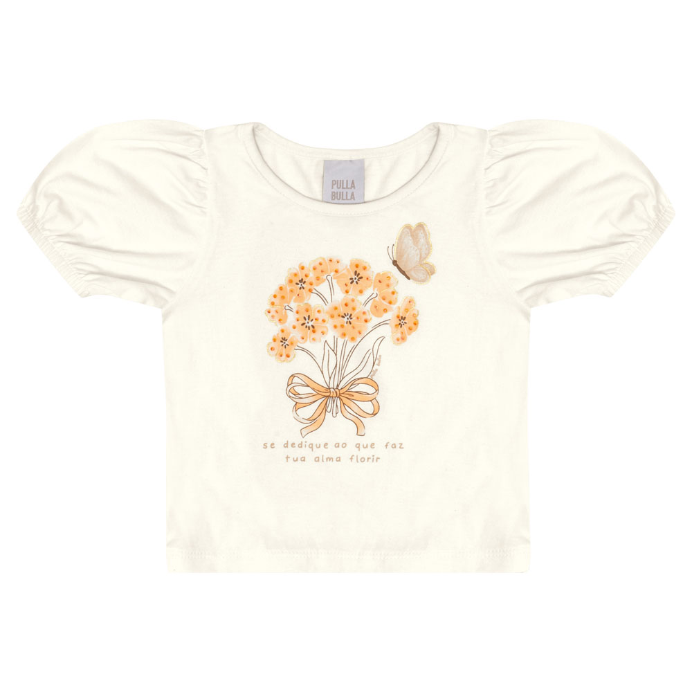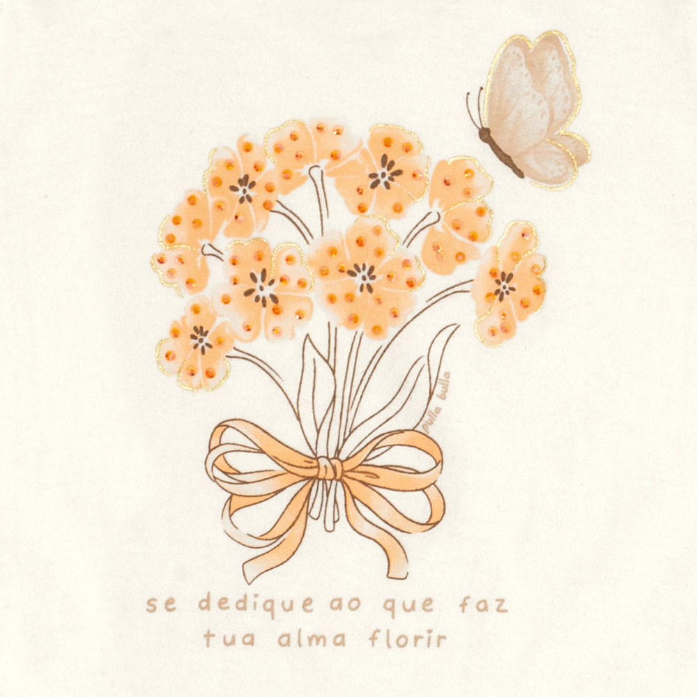 Conjunto charmoso e fofinho para combinar com sua fashionista! Composto por uma blusa na cor off white com decote arrecondado, mangas com elástico e pregas para efeito bufante leve e estampa buque de flores com strass e, short em moletinho na cor pêssego com elastano na cintura e detalhe de amarrar com laço.
