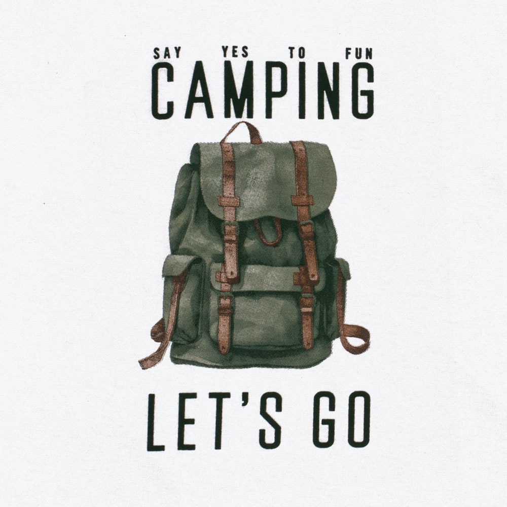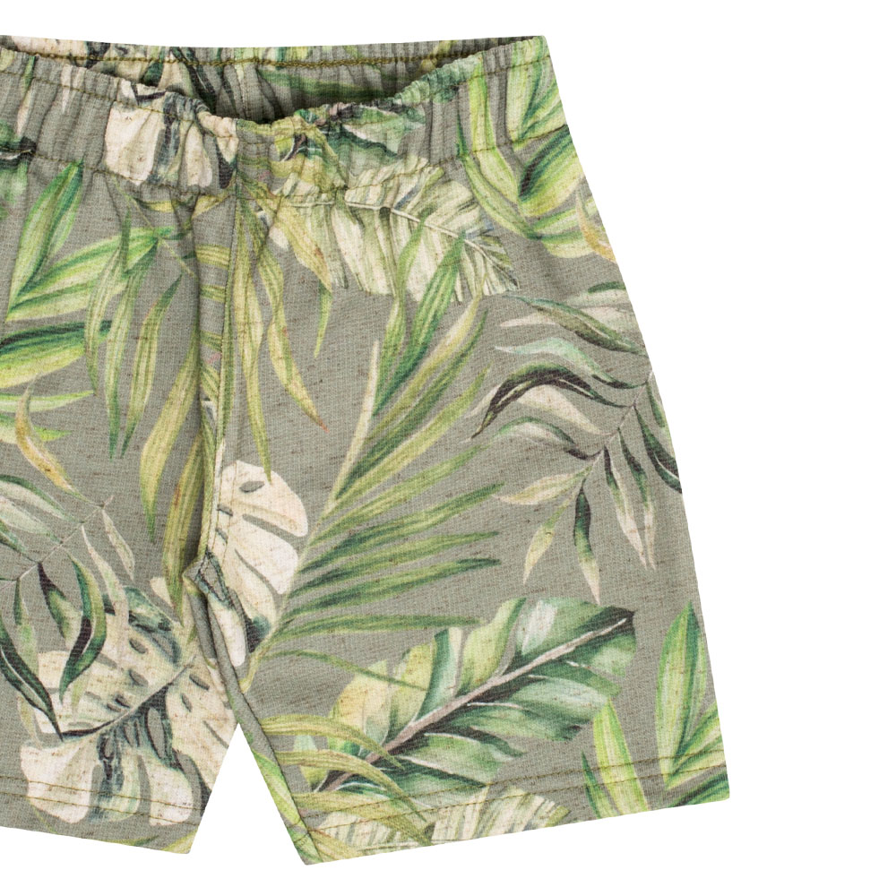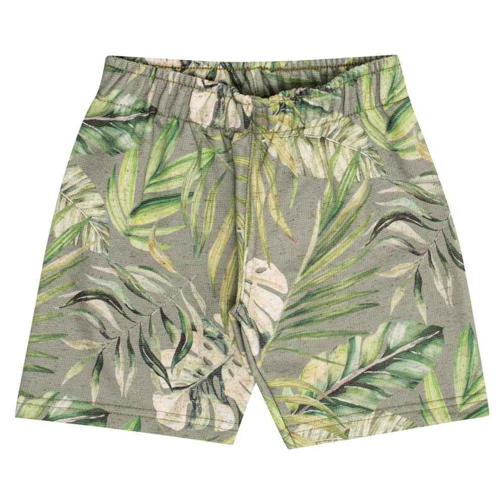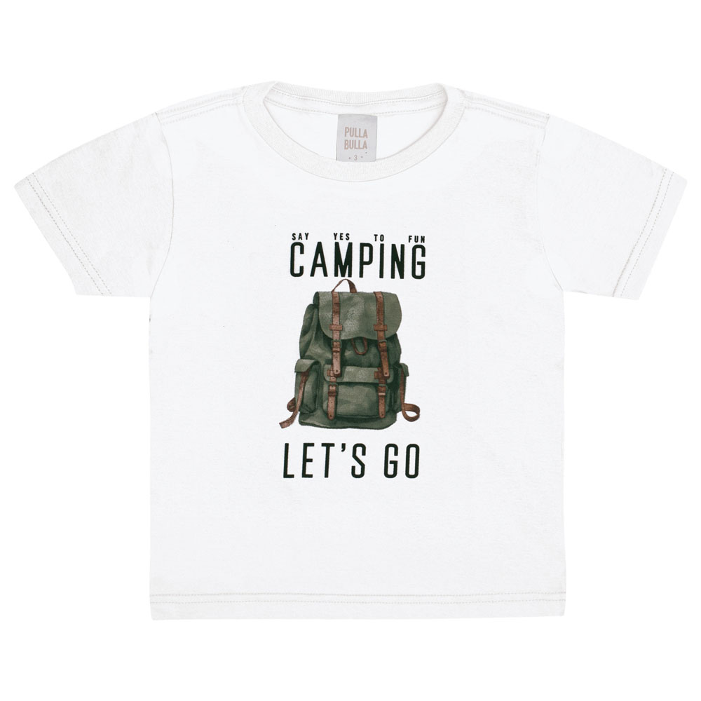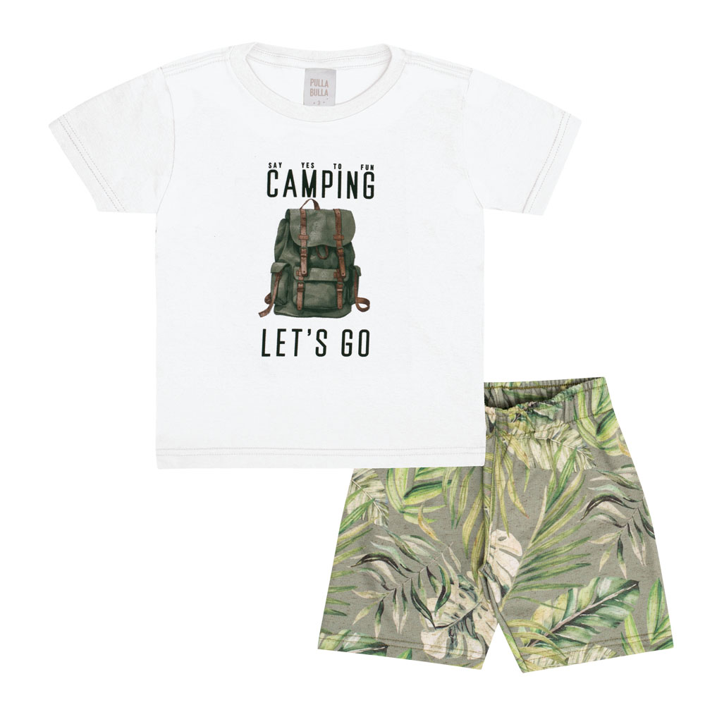 Partiu acampar no quinta da vovó! Nos dias quentes que tal brincar de acampamento vestindo looks fresquinhos e confortáveis, aposte no conjunto. Composto por uma camiseta meia malha na cor branca com estampa de mochila de acampamento e escrita “diga sim ao acampamento divertido. Vamos!” e bermuda moletom linho com estampa sublimado de folhas na cor chá verde.