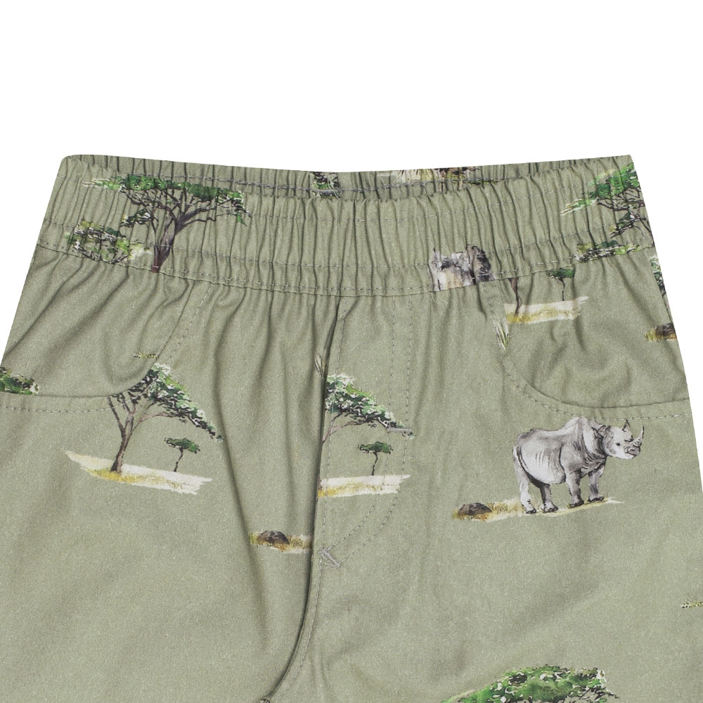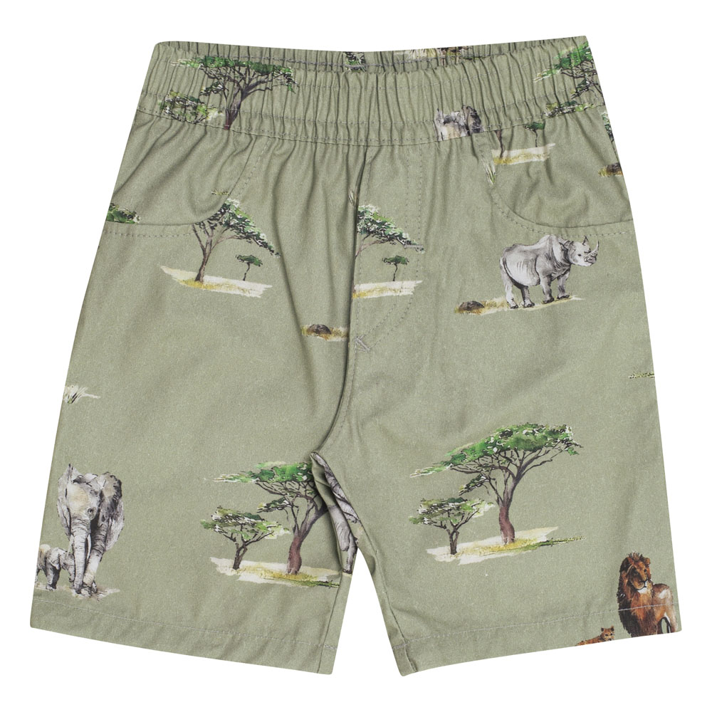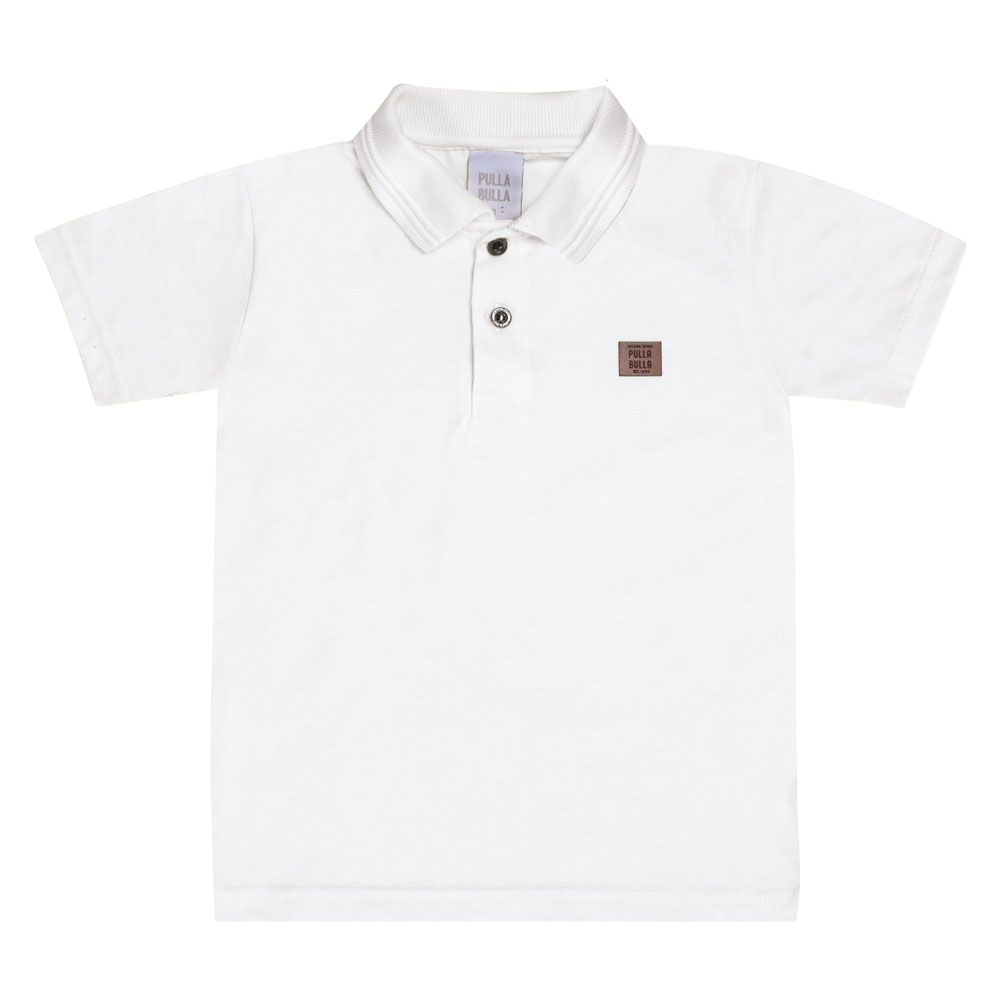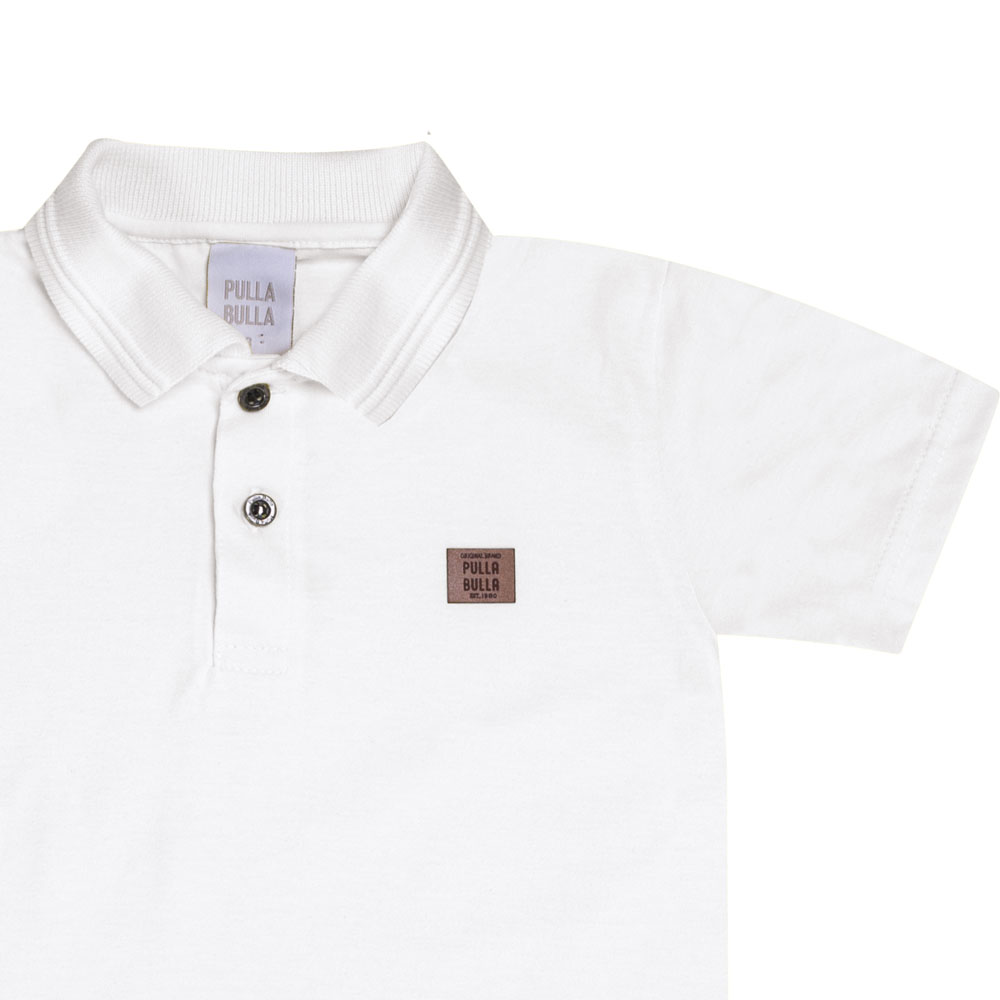 Conjunto primeiros passos masculino, composto por camiseta polo na cor branco em meia malha com abertura de botões na gola para melhor vestimenta e etiqueta termocolante próximo ao peito com a identificação Pulla Bulla. A bermuda é confeccionada em sarja leve na cor chá verde com estampa digital de safari. Ideal para passeios e momentos especiais.