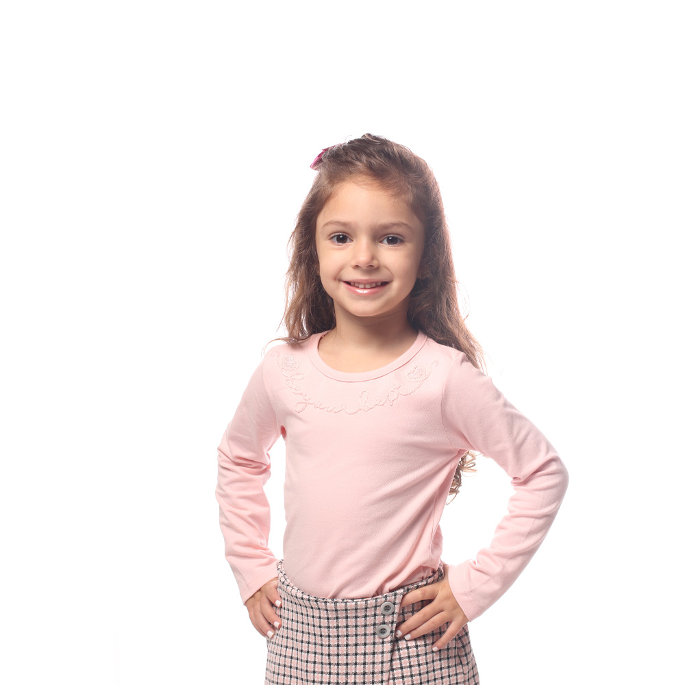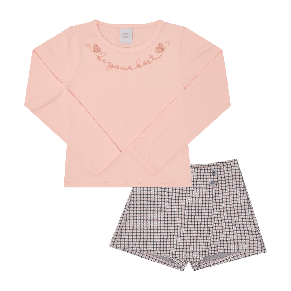 Para passear no shopping com a mamãe ou ocasiões especiais, os conjuntos são os favoritos para estes momentos. A blusa de manga longa em cotton leve na cor rosê possuí aplique bordado cordel coma frase “Seja o seu melhor” e o short saia xadrez rosê possuí detalhe de botões frontais, deixando o look despojado e moderno.