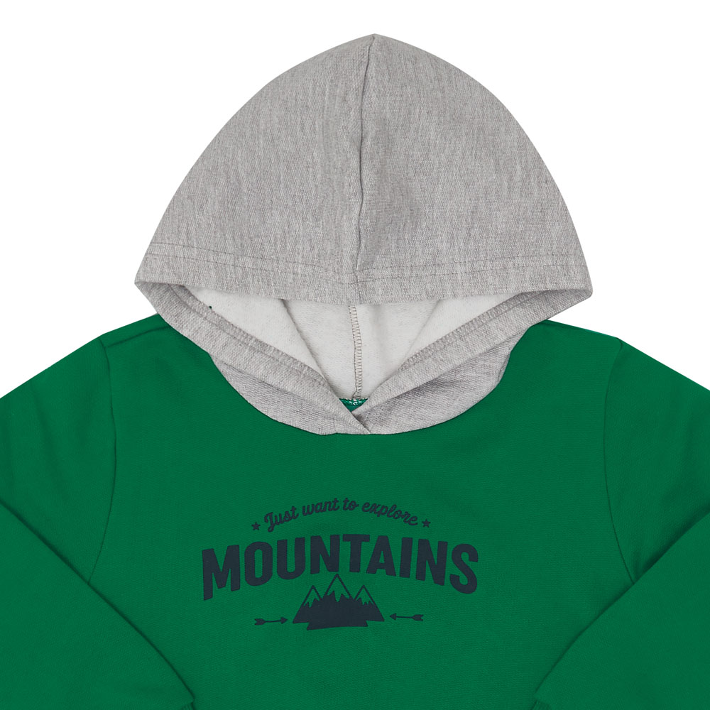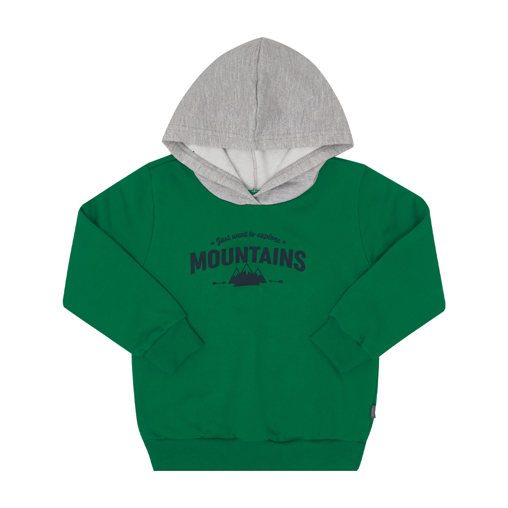 Ocasiões especiais ou passeios divertidos merecem um look confortável, quentinho e estiloso para os pequenos aventureiros. Confeccionado em moletom, o conjunto consta com blusão de manga lnoga na cor verde que contém capuz na cor marinho e estampa frontal de montanhas com escrita “Só quero explorar montanhas”. A calça na cor mescla cinza possuí elastano na cintura e na canela, deixando o look confortável e seguro para o seu pequeno.